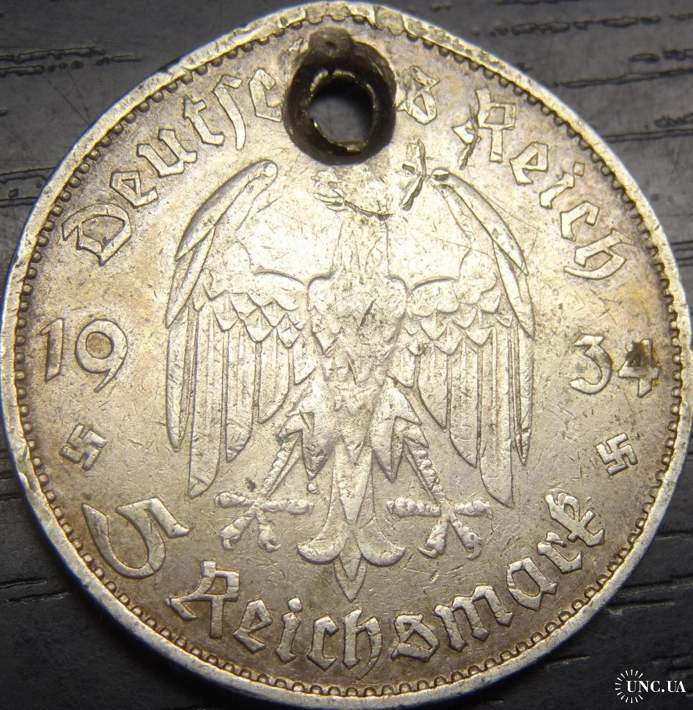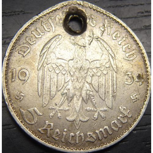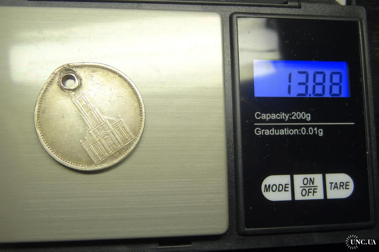 5 reichsmark Germany 1934 G Church (Karlsruhe mint) / 5 рейхсмарок 1934 G Німеччина Кірха (монетний двір - Карлсруе), срібло