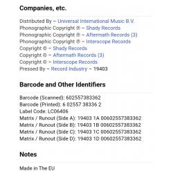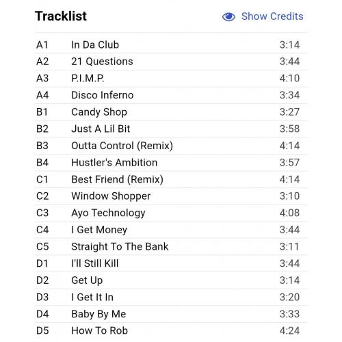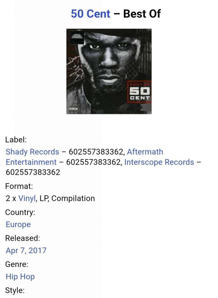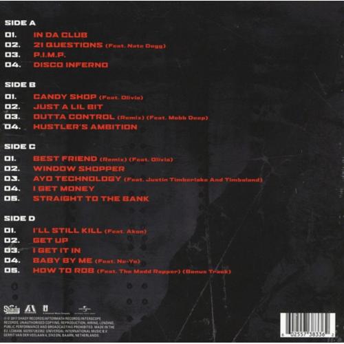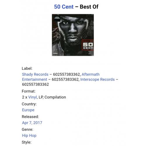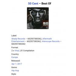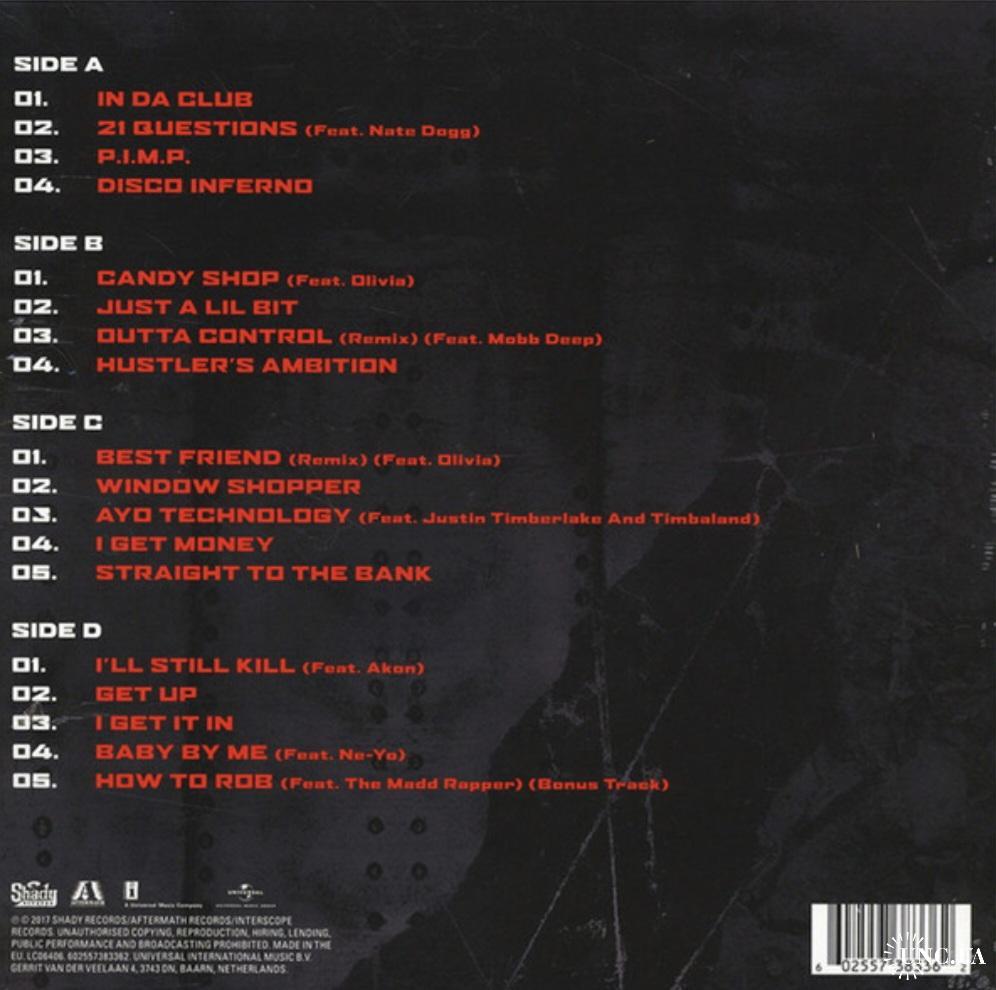 Вінілові платівки. Офіційна збірка найкращих хітів за всю дискографію, Американського репера та кіноактора Кертіса Джеймса Джексона III, більше відомого під сценічним ім,ям 50 Cent (Best Of) 2003-2014. Випуск фірми (Shady Records / Aftermath Entertainnment / Enterscope Records) Europe, 2017-ий рік. Видання з двох платівок (2LP). Нове, запаковане. Категорія S/S. Відправка по Україні службами доставки: Нова Пошта, Укр Пошта, Делівері. Також відправляємо посилки за кордон по цілому світу.
