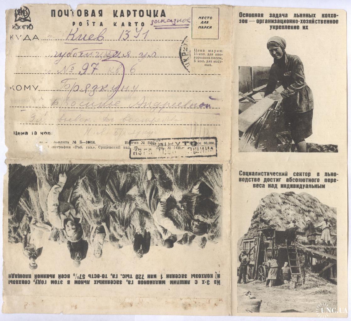 Рекламная почтовая карточка раскладушка 1930е Почта Киев Глубочицкая Пропаганда Колхоз Голодомор Лен