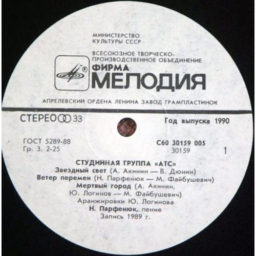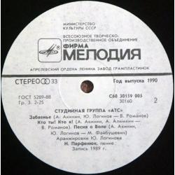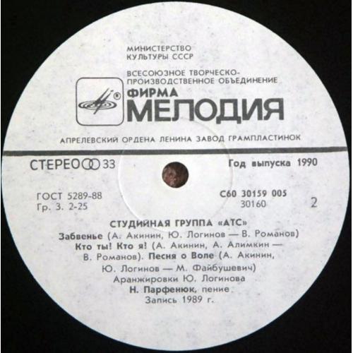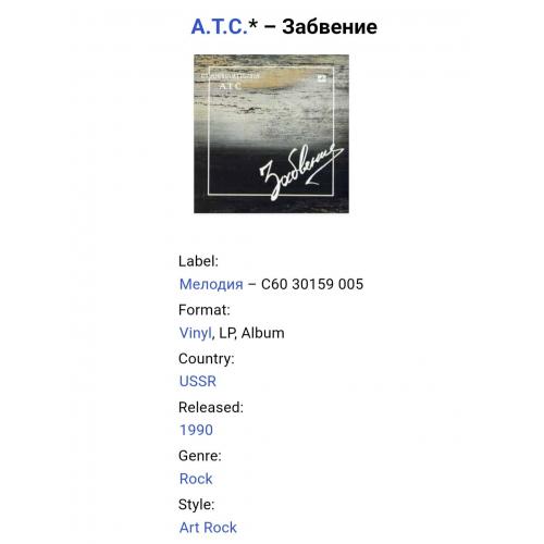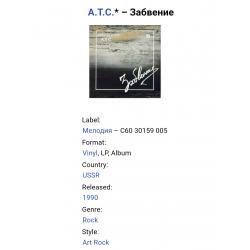 Вінілова платівка. Перший, дебютний, в дискографії, студійний альбом, російської (радянської) арт-групи А.Т.С. до складу якої входили музиканти Олександр Акінін, Микола Парфенюк, Юрій Логінов та Олексій Алімкін (Забвение) 1989. Випуск фірми (Мелодія) СРСР, 1990-ий рік. Платівка нова, неіграна, під голкою не була. Категорія M (Mint). Стан конверту NM-. Відправка по Україні службами доставки: Нова Пошта, Укр Пошта, Делівері. Також відправляємо посилки за кордон по цілому світу.