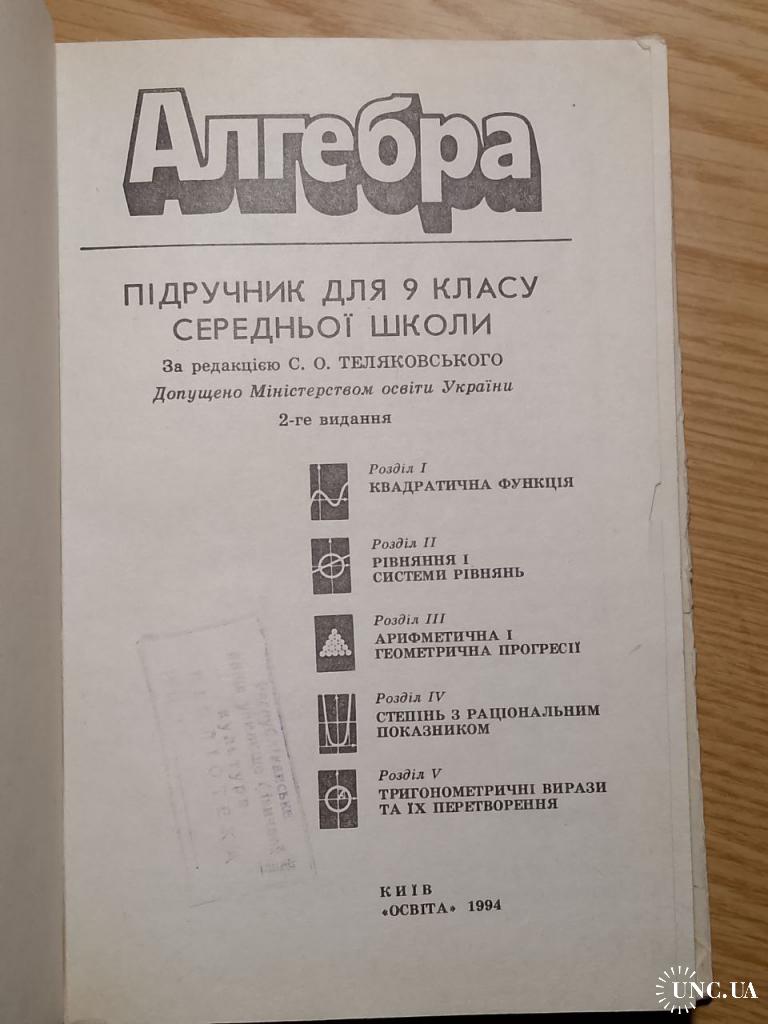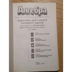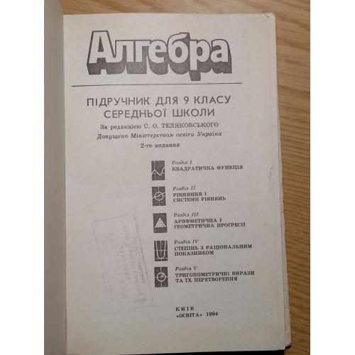 Алгебра. Підручник для 9 класу середньоїшколи. За ред. Теляковського. Видавництво: К. Освіта. 1994 р. Библиотечный штамп, носостояние очень хорошее