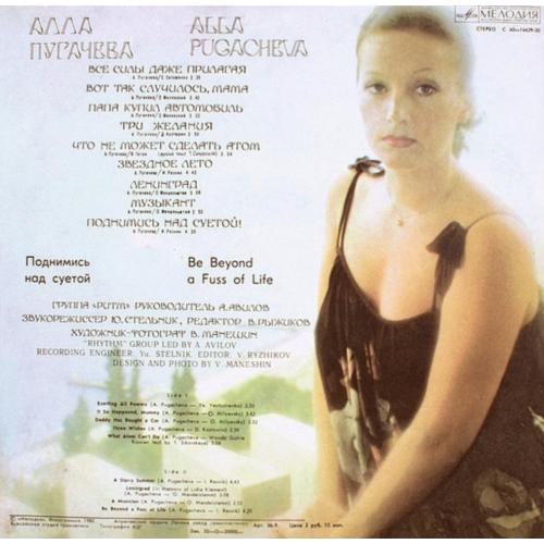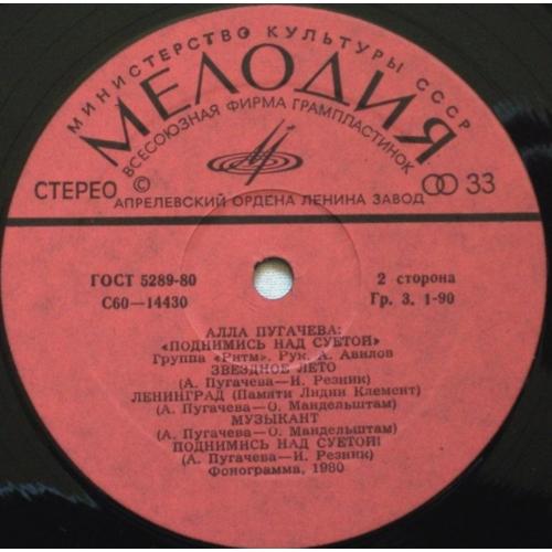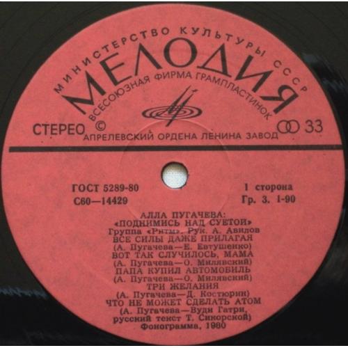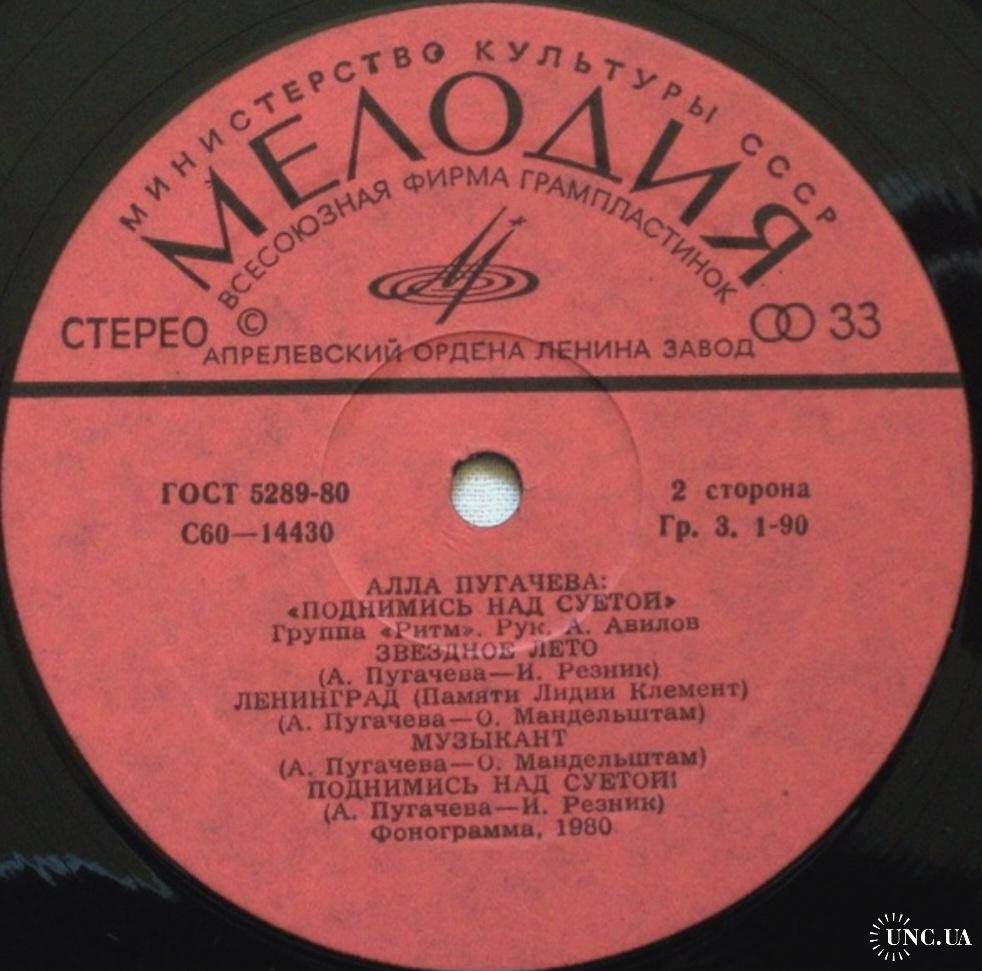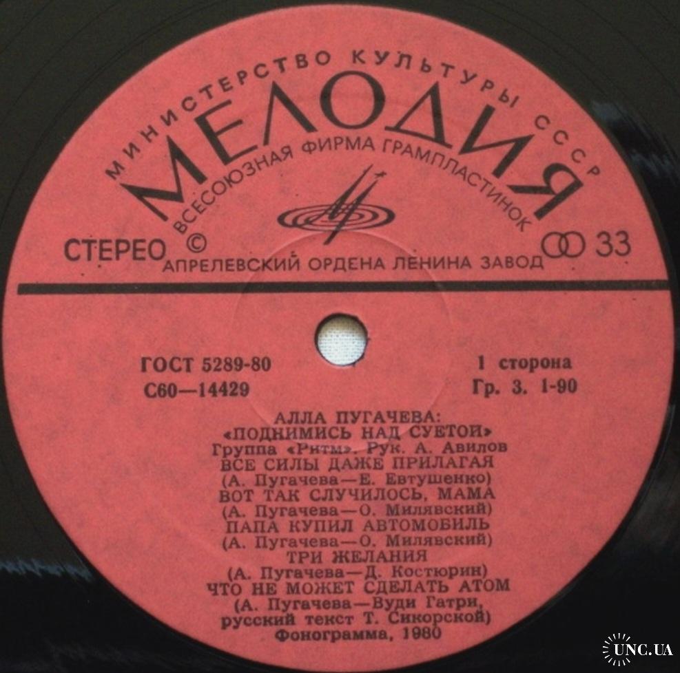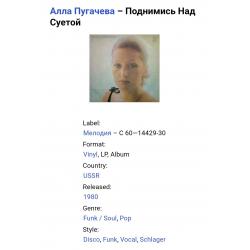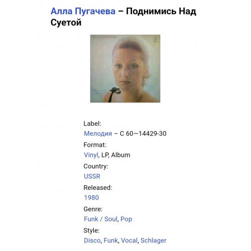 Вінілова платівка. Третій, в дискографії, студійний альбом російської (радянської) композиторки, кіноактриси і поп виконавиці, Заслуженої Артистки СРСР, примадонни естради, Алли Борисівної Пугачової (Поднимись Над Суетой) 1979. Випуск фірми (Мелодія) СРСР, Апрелєвським заводом грамплатівок, 1980-ий рік. Платівка нова, неіграна, під голкою не була. Категорія М (Mint). Стан конверту NM-. Відправка по Україні службами доставки: Нова Пошта, Укр Пошта, Делівері. Також відправляємо посилки за кордон по цілому світу.