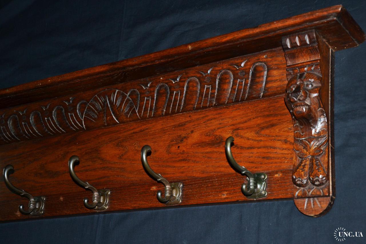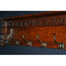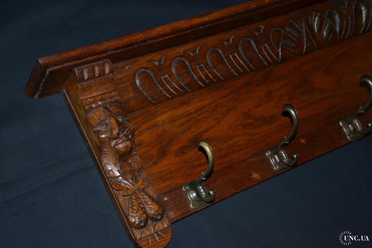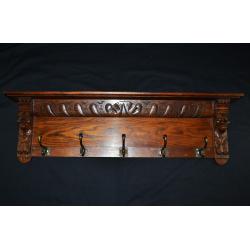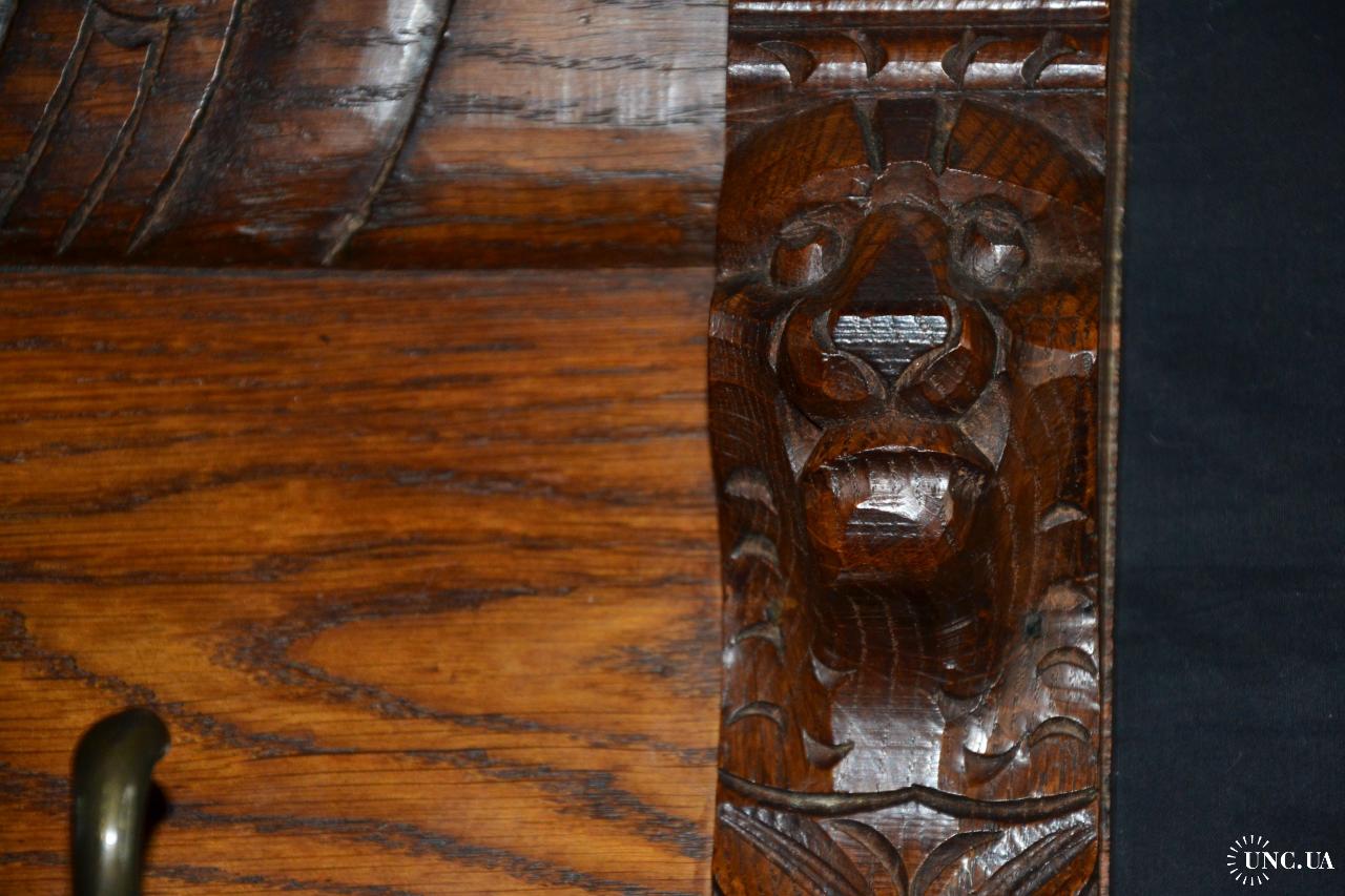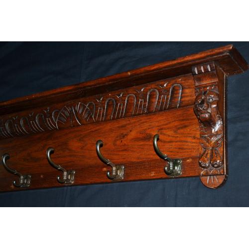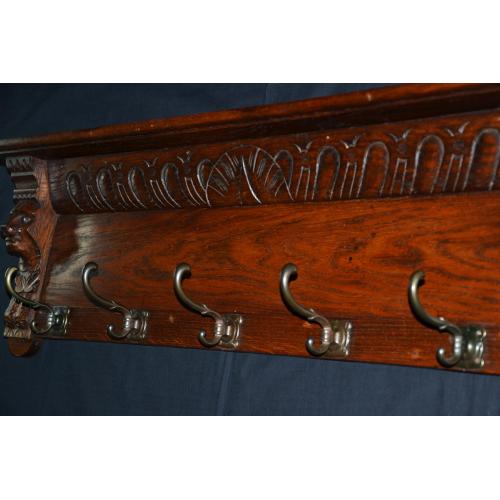 Антикварная деревянная вешалка для одежды с пятью двойными металлическими крючками, львиными головами и резьбой по дереву.