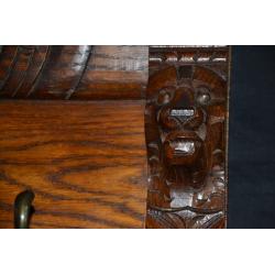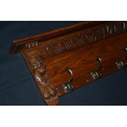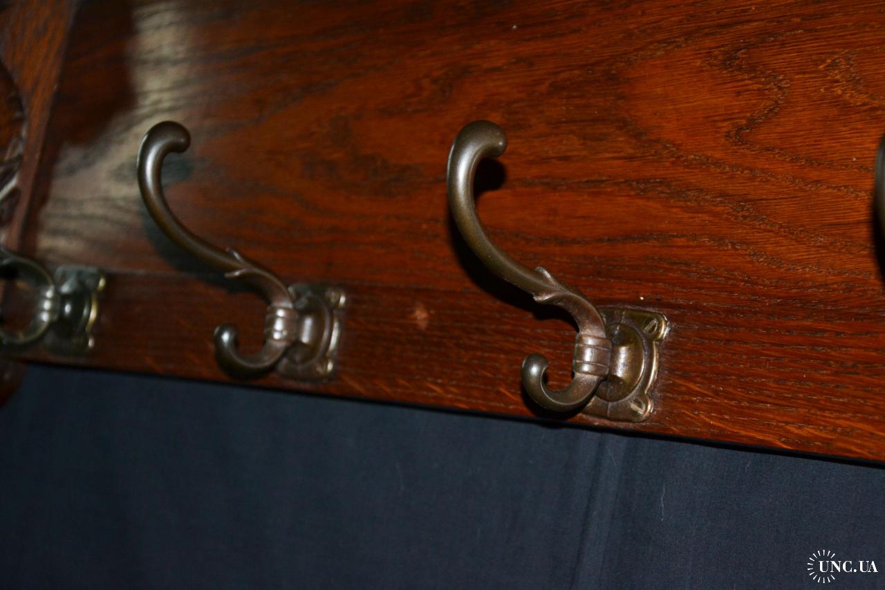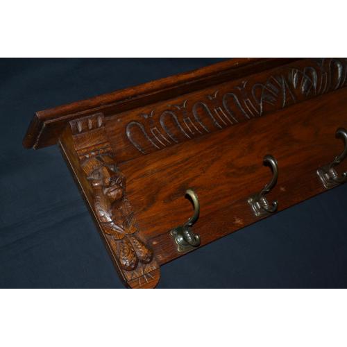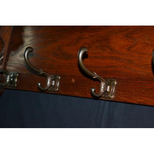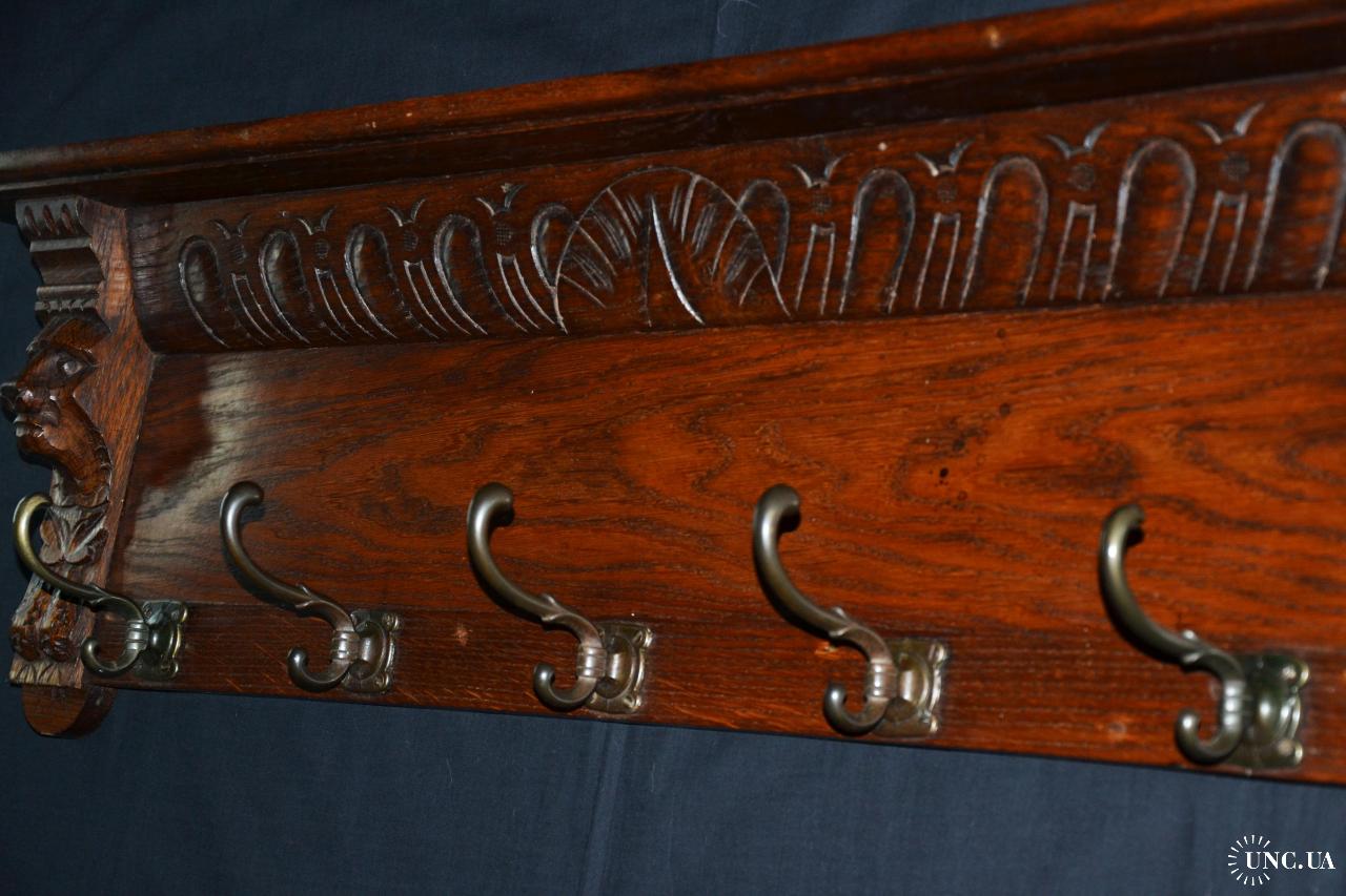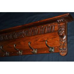 Антикварная деревянная вешалка для одежды с пятью двойными металлическими крючками, львиными головами и резьбой по дереву.