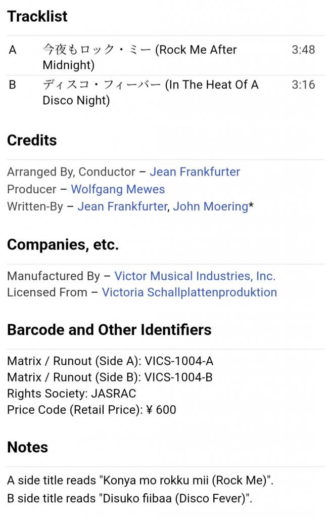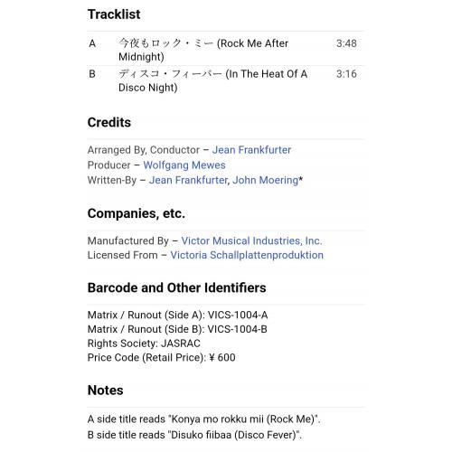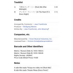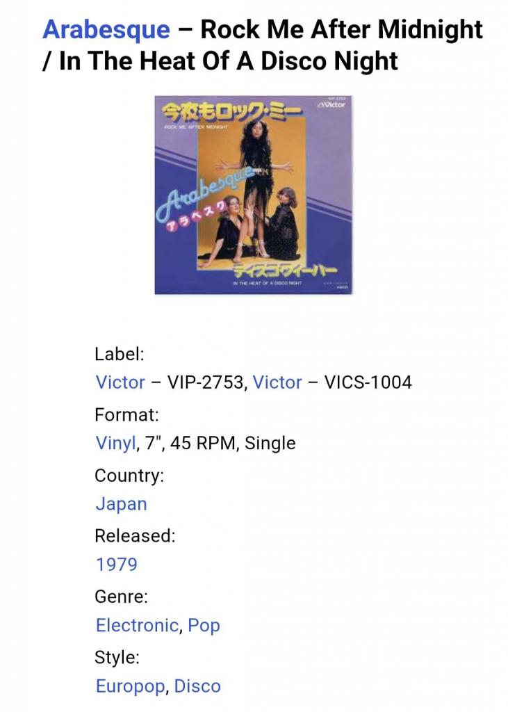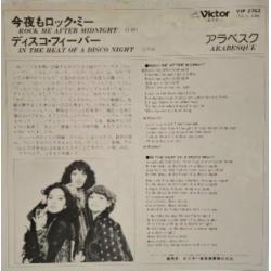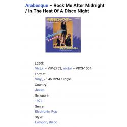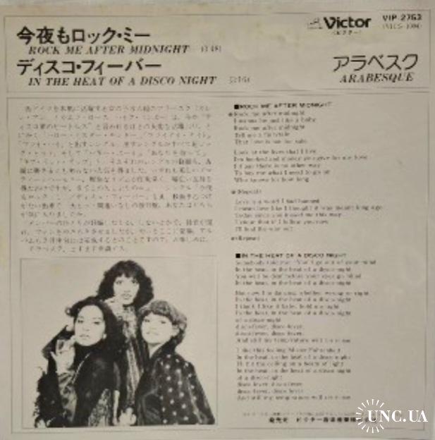 Вінілова платівка. П'ятий, в дискографії, студійний міні сингл (ЕР 7), легендарної Німецької жіночої групи стилю диско, гай-енерджі Арабески, до складу якої на той період часу входили учасниці Сандра Лауер, Жасмін Феттер та Міхаела Розе (Rock Me After Midnight / In The Heat Of A Disco Night) 1979. Випуск фірми (Victor) Japan, 1979-ий рік. Оригінальне, першопресове Японське видання. Рідкісне (Rare). Стан платівки EX+. Стан конверту EX+. В комплекті внутрішня вставка. Відправка по Україні службами доставки: Нова Пошта, Укр Пошта, Делівері. Також відправляємо посилки за кордон по цілому світу.