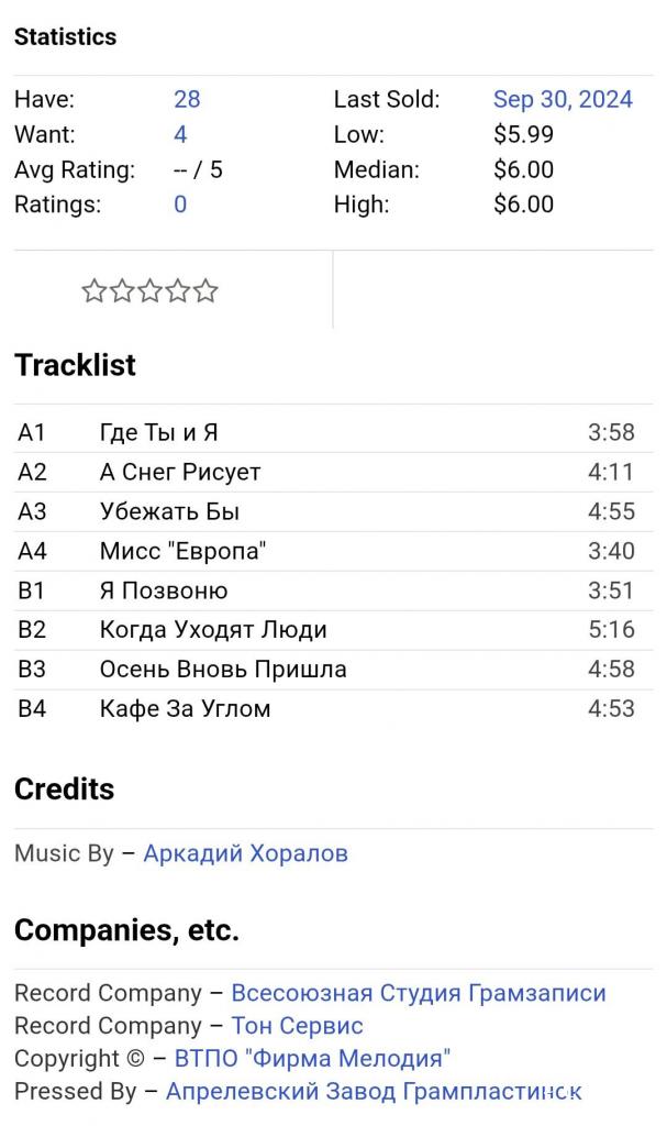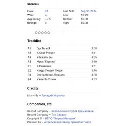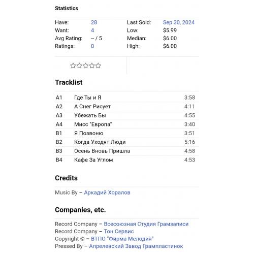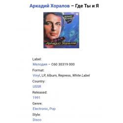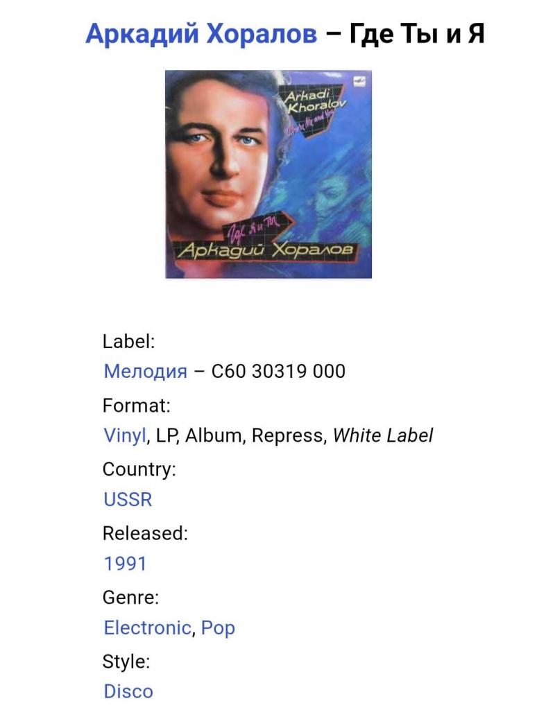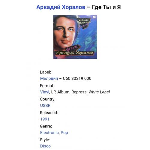 Вінілова платівка. Четвертий, в дискографії, студійний альбом, Українського (радянського), композитора і виконавця стилю поп-музика, учасника легендарних вокально інструментальних ансамблів Червона Рута, Грифы, Поют Гитары, Самоцветы, Красные Маки, Эдельвейс, Аркадія Хоралова і групи Парни (Где я И Ты) 1989. Випуск фірми (Мелодія) СРСР, Апрелєвський завод грамплатівок, 1991-ий рік. Стан платівки MM-. Стан конверту NM-. Відправка по Україні службами доставки: Нова Пошта, Укр Пошта, Делівері. Також відправляємо посилки за кордон по цілому світу.