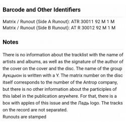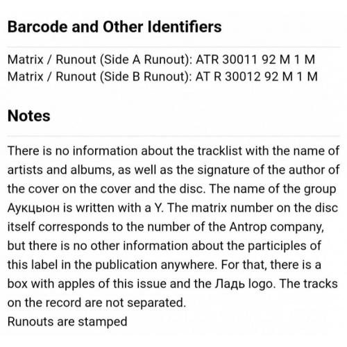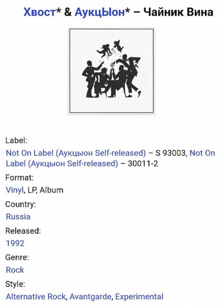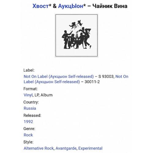 Вінілова платівка. Шостий, в дискографії, студійний альбом, російської (радянської) пост панк, джаз рок групи нової хвилі Аукцион який вони записали спільно з музикантом і художником Олексійом Хвостенко (Хвост). В складі Аукциону на той час були Олег Гаркуша, Леонід Фьодоров, Сергій Рогожин, Віктор Бондарик, Дмитро Озерський, Микола Рубанов, Микола Федорович та Ігор Чериднік (Чайник Вина) 1992. Випуск фірми (Ладь) Russia, 1992-ий рік. Оригінальне, першопресове видання. Лімітований тираж (Limited Edition). Рідкісне (Rare). Стан платівки ЕХ+. Конверт репліка. Виготовлений по спеціальному замовленню з оригіналу. Глянцевий, новий. Стан конверту M. Відправка по Україні службами доставки: Нова Пошта, Укр Пошта, Делівері. Також відправляємо посилки за кордон по цілому світу.