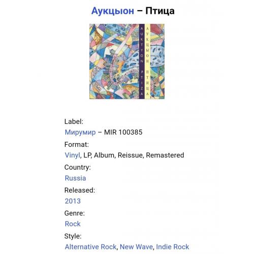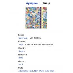1981-2000Вінілові платівки. Сьомий, в дискографії, студійний альбом російської (радянської) психоделік, авангард, прог, джаз рок-групи Аукцион (Птица) 1994. Випуск фірми (МируМир) Russia, 2013-ий рік. Лімітований тираж (Limited Edition). Стан платівок NM-. Стан конверту NM-. В комплекті внутрішня вставка. Відправка по Україні службами доставки: Нова Пошта, Укр Пошта, Делівері. Також відправляємо посилки за кордон по цілому світу.