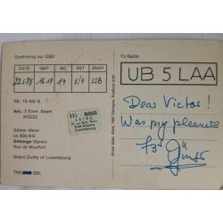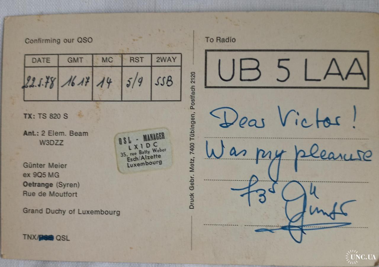 Рекламная открытка. Напечатана в Тюбингене, Германия. На лицевой стороне размещен позывной сигнал радиолюбителя из Люксембурга и его и его локация. Наобратной стороне – данные радиообмена в эфире, локация с полным названием страны: Великое Герцогство Люксембург. P.S. Обращаю внимание любознательных, что начало радиолюбительских позывных (префикс) страны идентичен , как правило, с префиксом летательных аппаратов во всём мире. Например на фото, на фюзеляже, имеется надпись: «LX-DCV”. Карточка без дефектов. Состояние отличное.