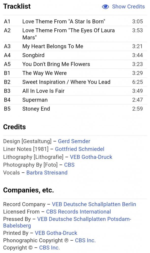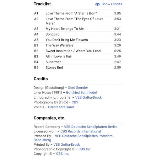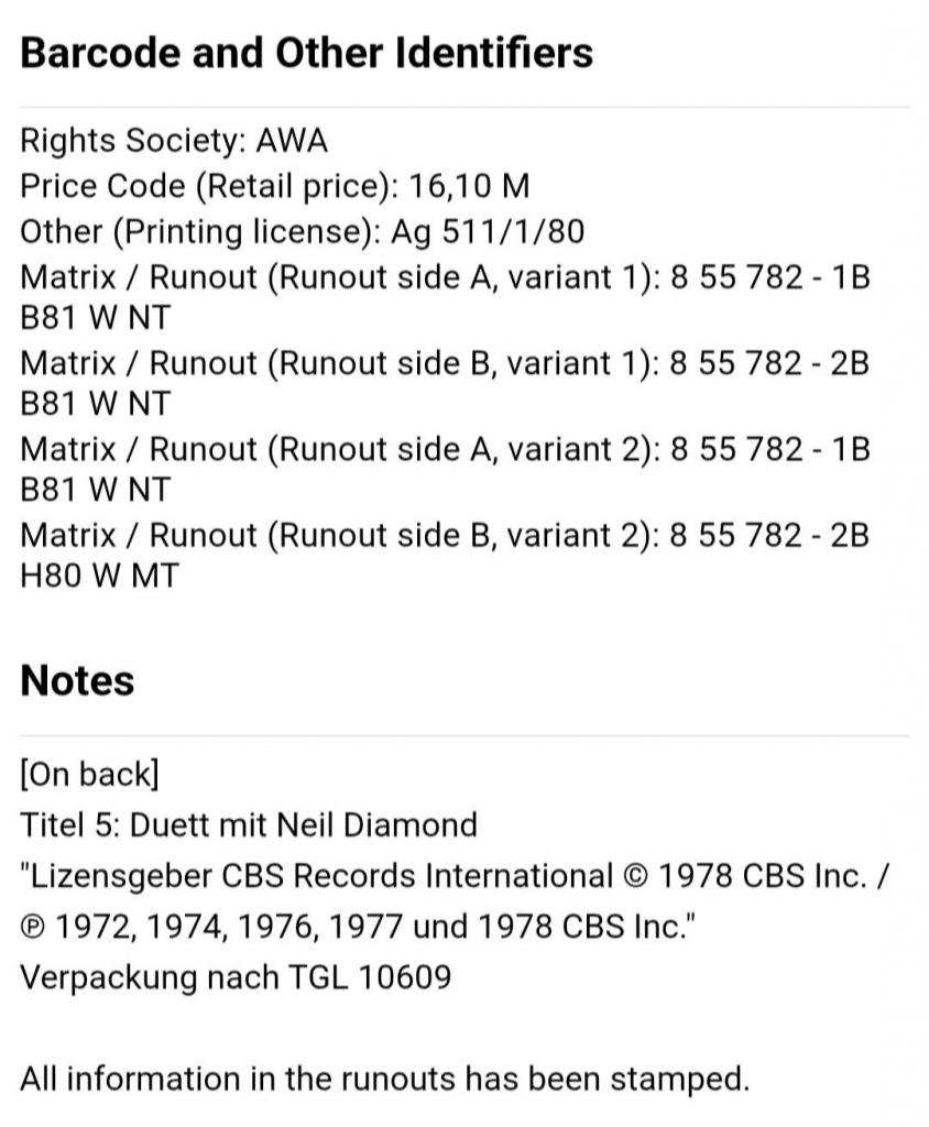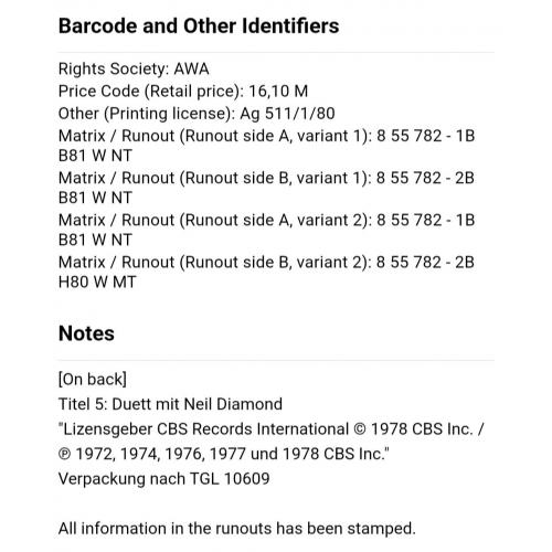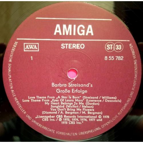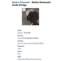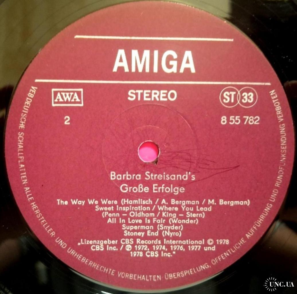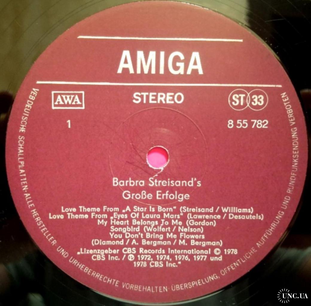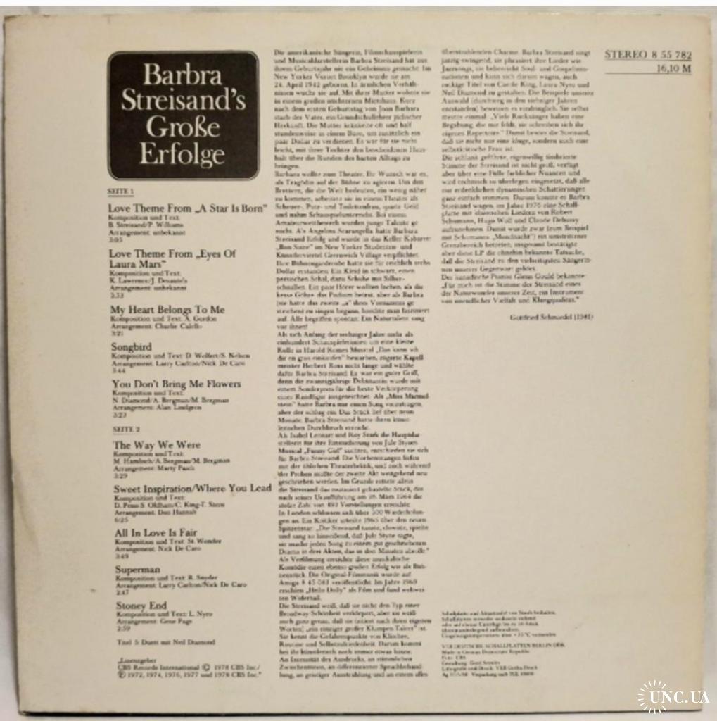 Вінілова платівка. Офіційна збірка найкращих хітів Американської вокалістки, композиторки, продюсерки, актриси, режисерки та поп-рок виконавиці, володарки титулів Оскар, Еммі, Греммі та Золотий Глобус, Барбри Джоан Стрейзанд (Barbra Streisand's Grobe Erfogle) 1972-78. Випуск фірми (Amiga) GDR, 1981-ий рік. Стан платівки ЕХ+. Стан конверту ЕХ+. Відправка по Україні службами доставки: Нова Пошта, Укр Пошта, Делівері. Також відправляємо посилки за кордон по цілому світу.