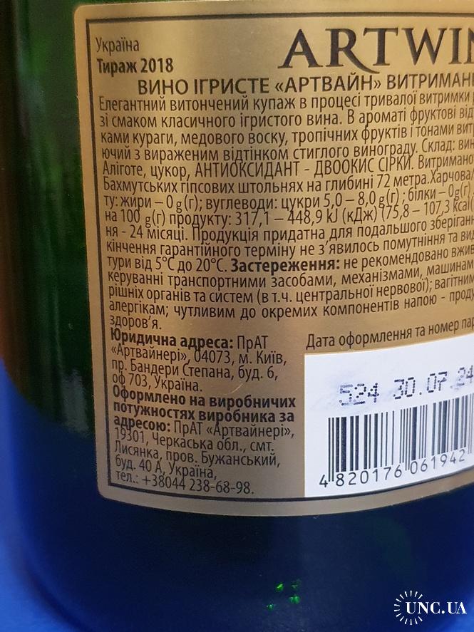 Шампанское "Artwine" белое п/сладкое выдержка 36 месяцев, винтаж 2017.