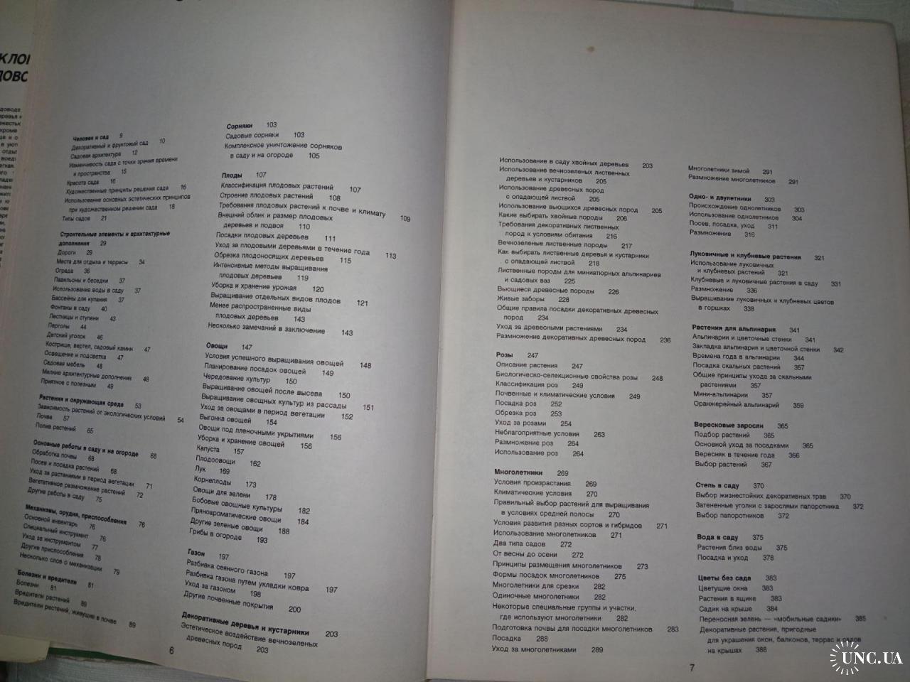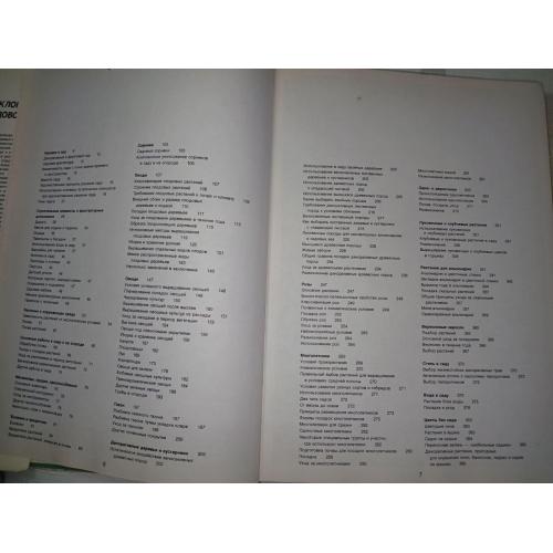 Декоративный и фруктовый сад, работы в саду, строительные элементы и архитектурные дополнения, растения, почва, полив, механизмы, орудия, приспособления, болезни и вредители, сорняки, плоды, овощи, газон, розы, многолетники, одно- и двулетники, луковичные и клубневые растения, растения для альпинария, вересковые заросли, степь в саду, цветы без сада и многое другое. Алфавитный указатель русских и латинских названий. Плотная бумага.