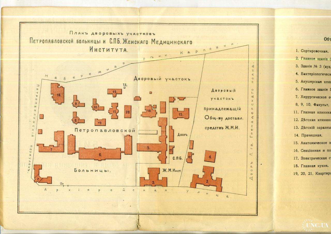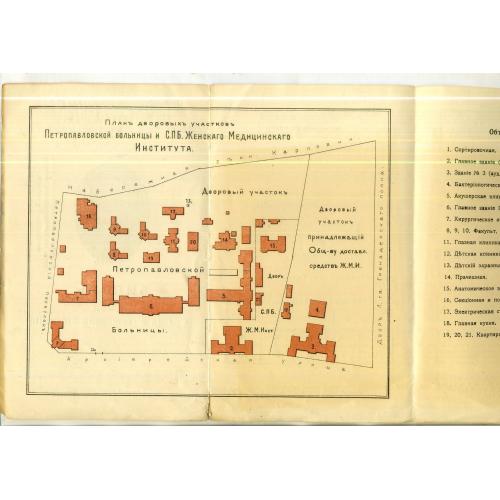 Съезд в С.-Петербурге, 21-28 апреля 1910г, раскладушка из 3х листов, внутренний разворот - карта Петропавловской больницы и СПб Женского медицинского института
