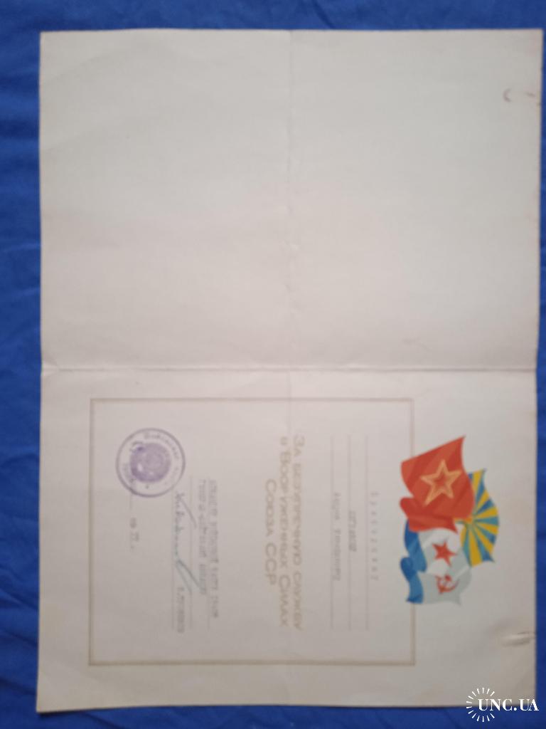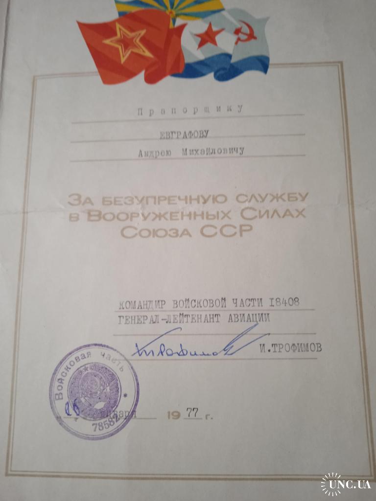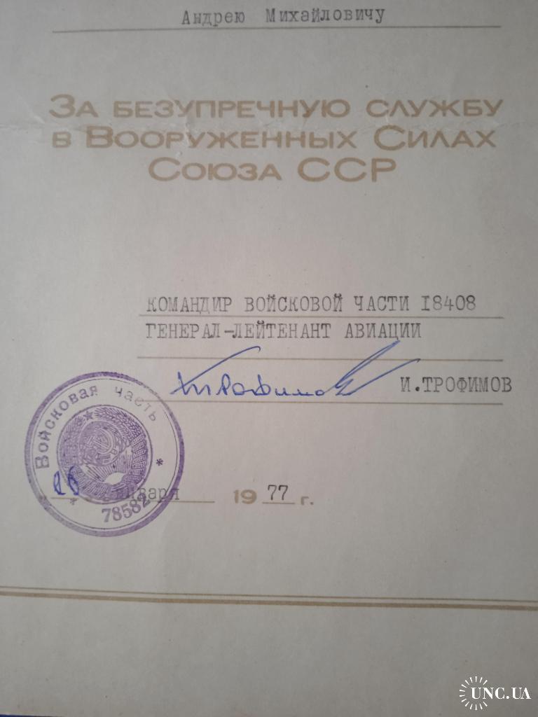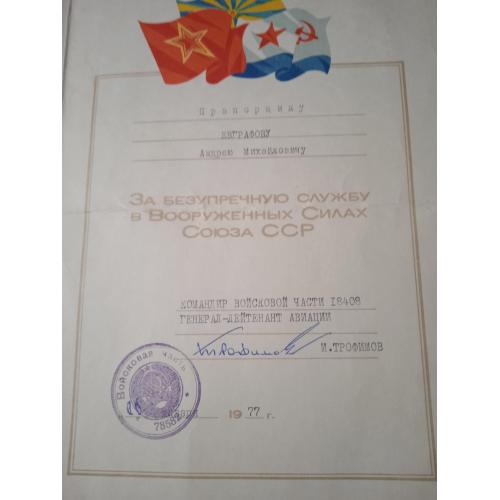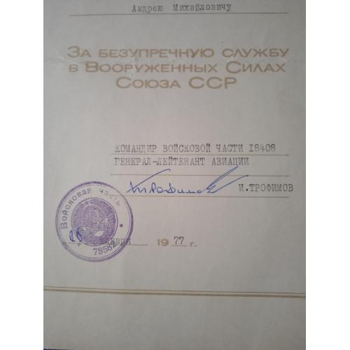 1961-1980Грамота За безупречную службу в Вооружённых силах Союза ССР выдана к знаку ёжику , Подпись Генерал-лейтенанта авиации 1977г.