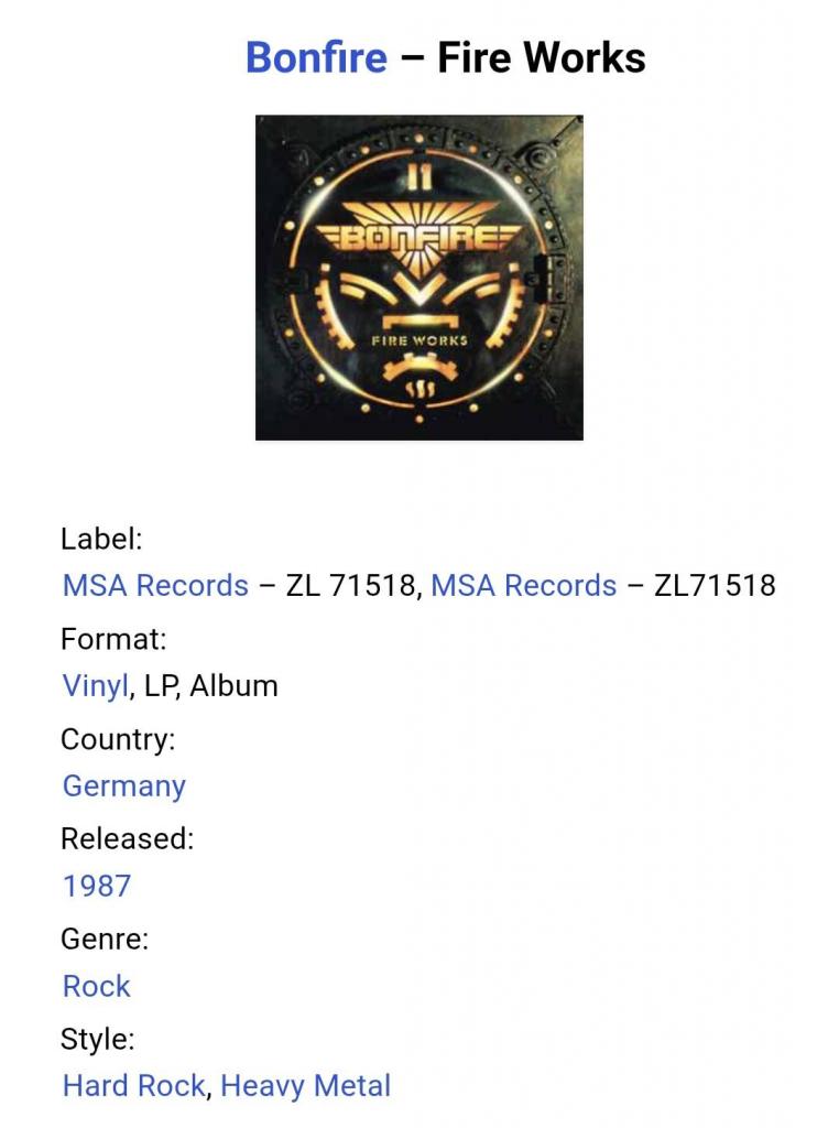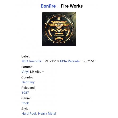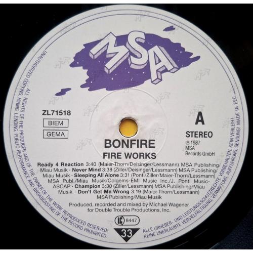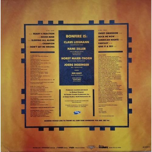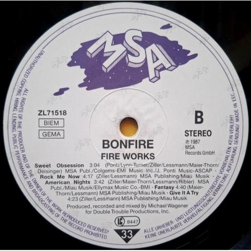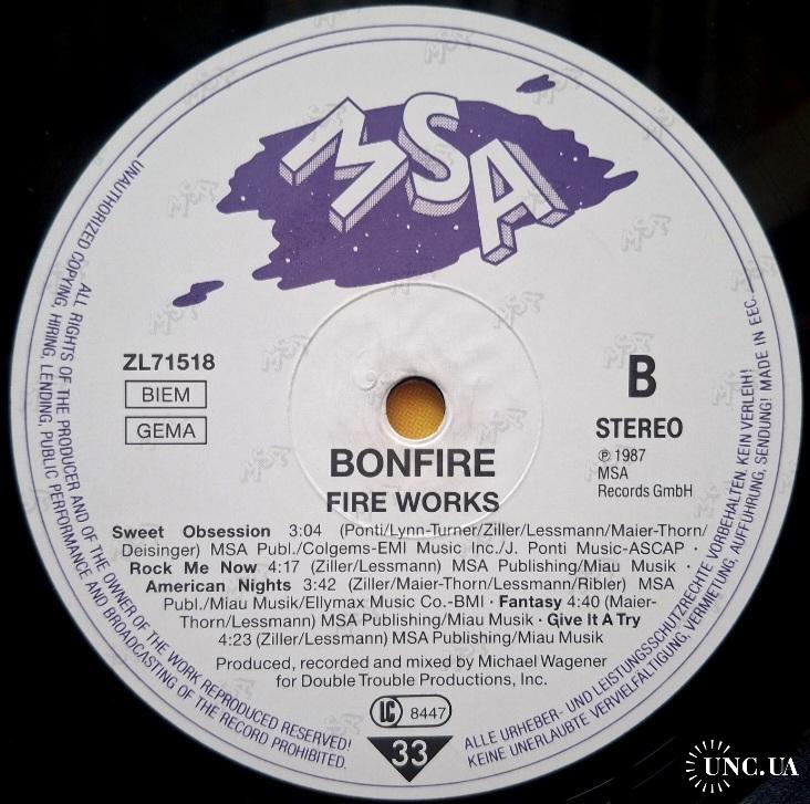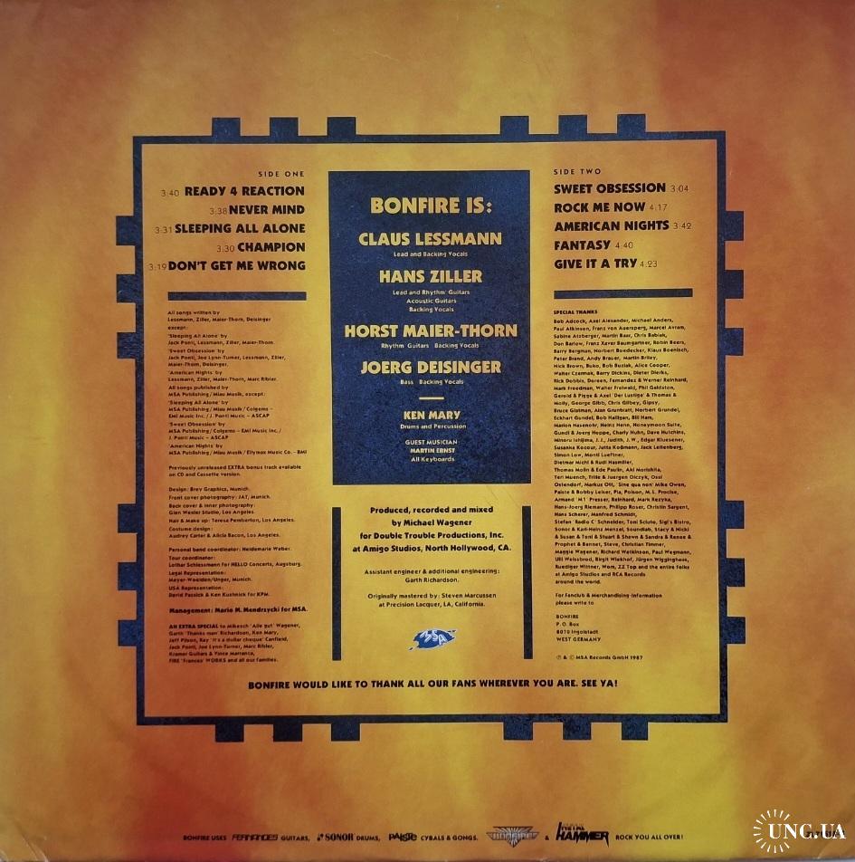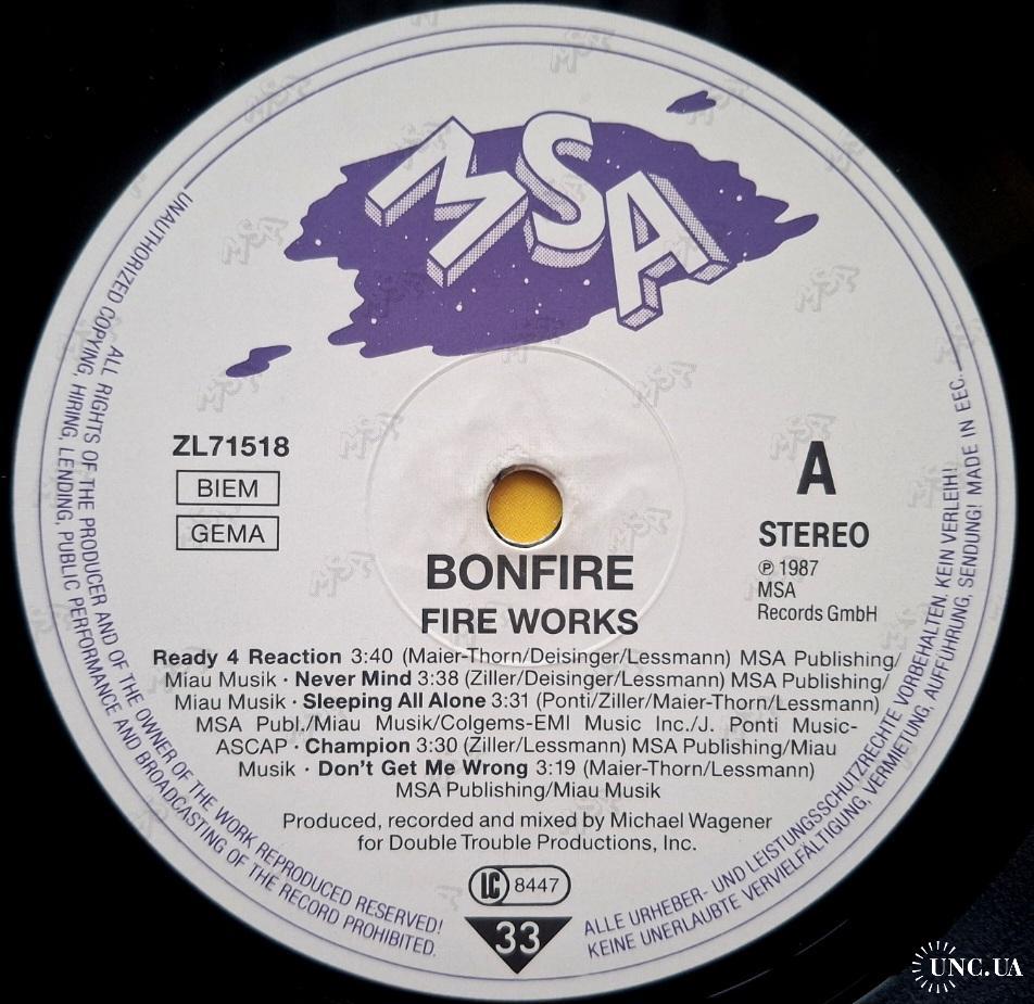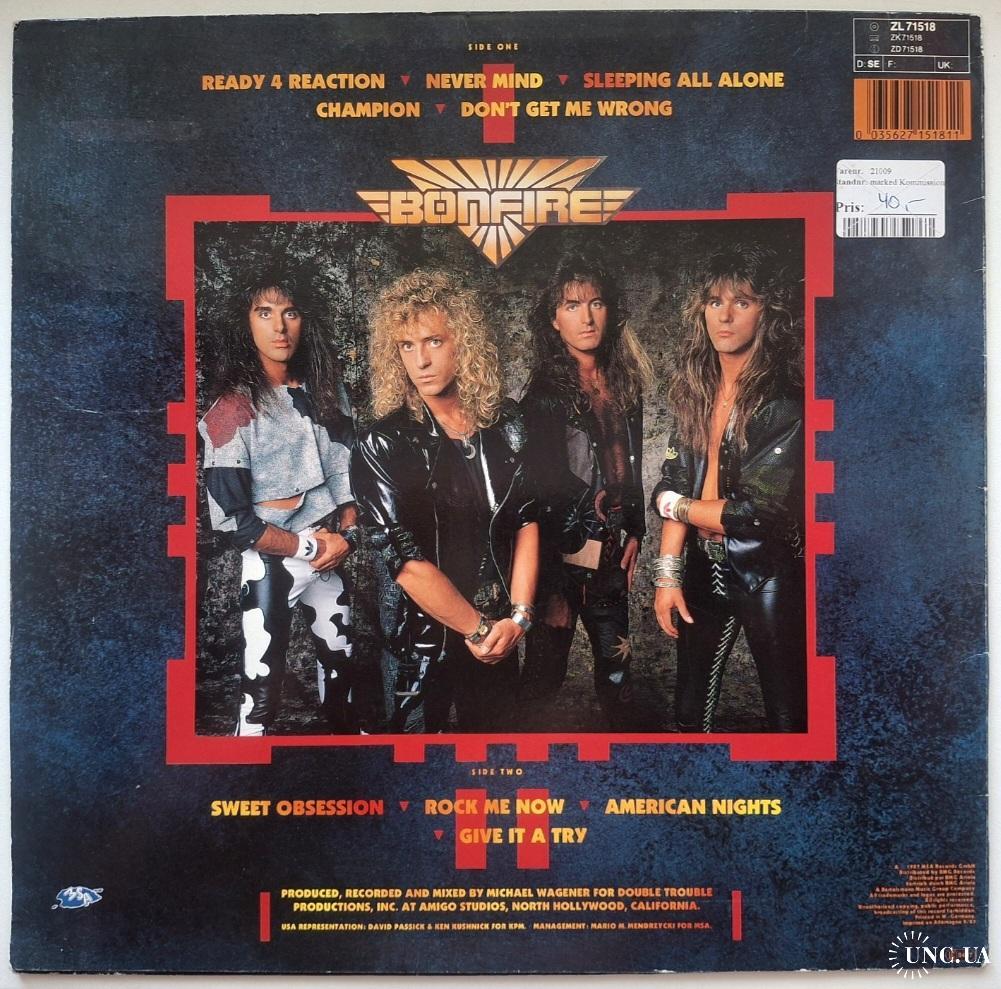 Вінілова платівка. Другий, в дискографії, студійний, альбом, Німецької хард-рок, хеві-метал групи Bonfire, яка складалась на той час з учасників: Клауса Лесмана, Ханса Ціллера, Хорста Майєра Торна та Йорга Дайсінгера (Fire Works) 1987. Випущено фірмою (MSA Records) Germany, 1987-ий рік. Оригінальне, першопресове, Німецьке видання. Стан платівки ЕХ-/VG+. Конверт глянцевий. Стан конверту EX. В комплекті внутрішня вставка. Відправка по Україні службами доставки: Нова Пошта, Укр Пошта, Делівері. Також відправляємо посилки за кордон по цілому світу.