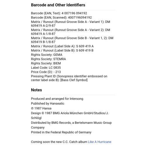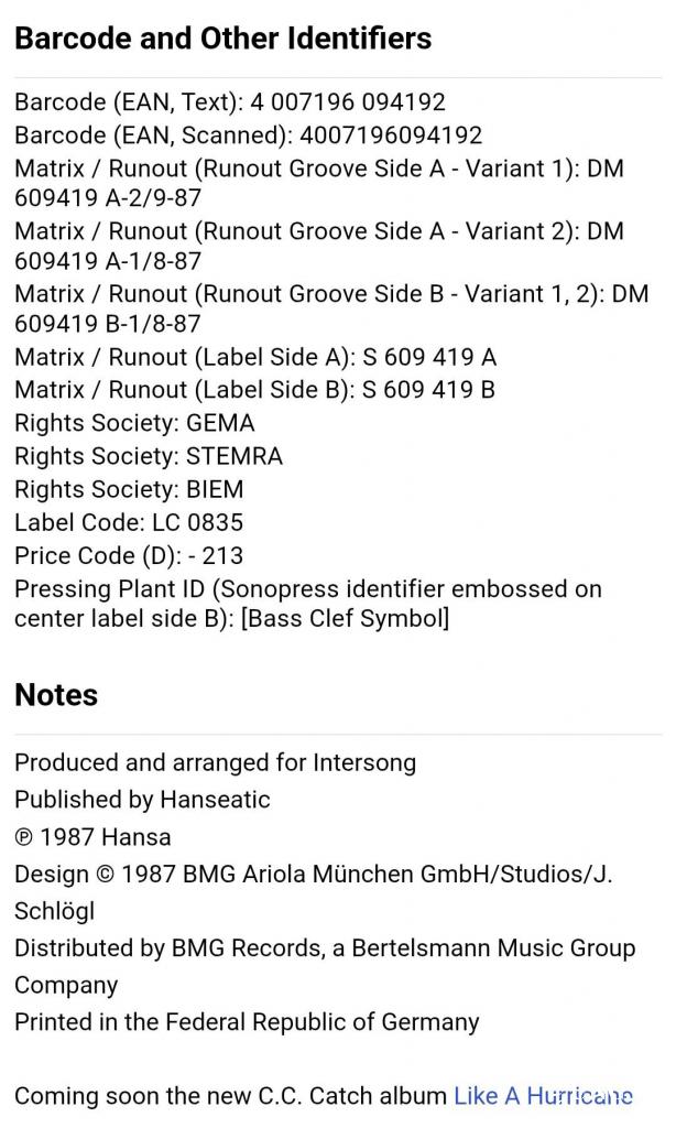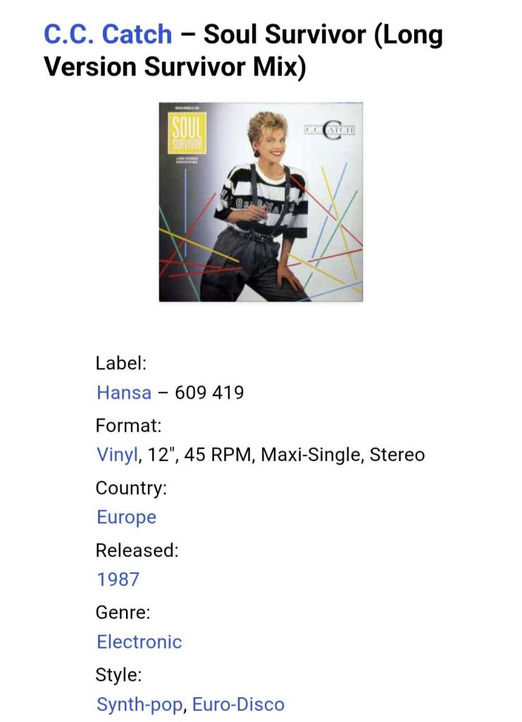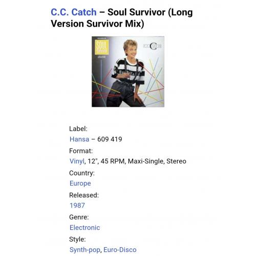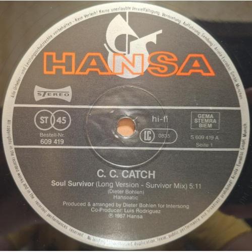 Вінілова платівка. Сьомий, в дискографії, студійний максі сингл (EP 12), легендарної Німецької виконавиці Голландського походження, стилю Євро Диско, Кароліни Катерини Мюллер, більше відомої під сценічним ім,ям C.C. Catch (Soul Survivor) 1987. Випуск фірми (Hansa) Germany, 1987-ий рік. Оригінальне, першопресове, рідне Німецьке видання. Стан платівки VG. Конверт глянцевий. Стан конверту ЕХ+. Відправка по Україні службами доставки: Нова Пошта, Укр Пошта, Делівері. Також відправляємо посилки за кордон по цілому світу.