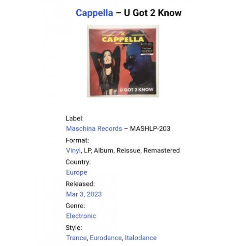 1981-2000Вінілова платівка. Другий, в дискографії, студійний альбом, Італійського євро денс, транс, італо денс проекту Cappella, який складався з учасників Келлі Оверетти та Родні Бішопа (U Got 2 Know) 1994. Випуск (Maschina Records) Estonia, 2023-ій рік. Лімітований тираж (Limited Edition). Видання нове, запаковане. Категорія S/S. Відправка по Україні службами доставки: Нова Пошта, Укр Пошта, Делівері. Також відправляємо посилки за кордон по цілому світу.