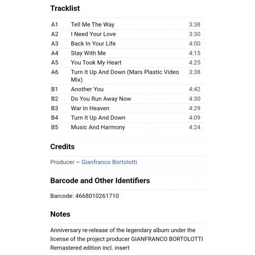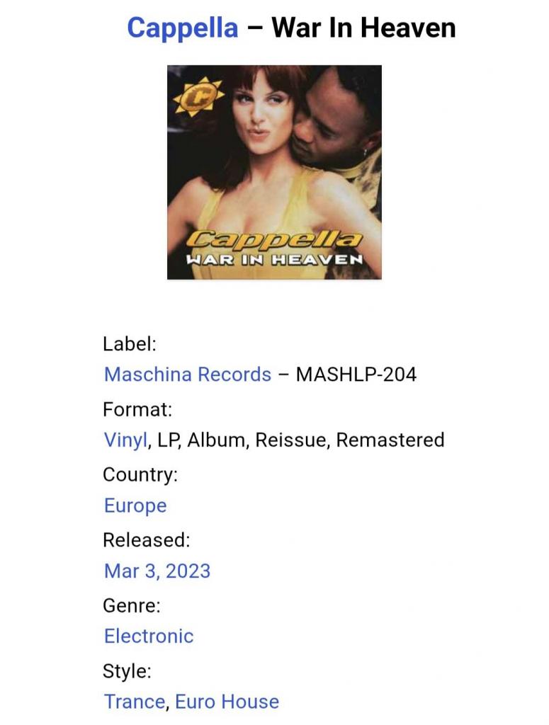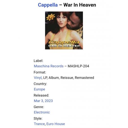 1981-2000Вінілова платівка. Четвертий, в дискографії, студійний альбом, Італійського євро денс, транс, італо денс проекту Cappella, який складався з учасників Келлі Оверетти та Родні Бішопа (War In Heaven) 1996. Випуск (Maschina Records) Estonia, 2023-ій рік. Лімітований тираж (Limited Edition). Видання нове, запаковане. Категорія S/S. Відправка по Україні службами доставки: Нова Пошта, Укр Пошта, Делівері. Також відправляємо посилки за кордон по цілому світу.