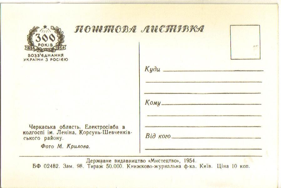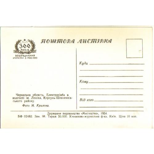 Черкасская область Корсунь-Шевченковский район электросеялка 1954 300 лет воссоединения Мистецтво