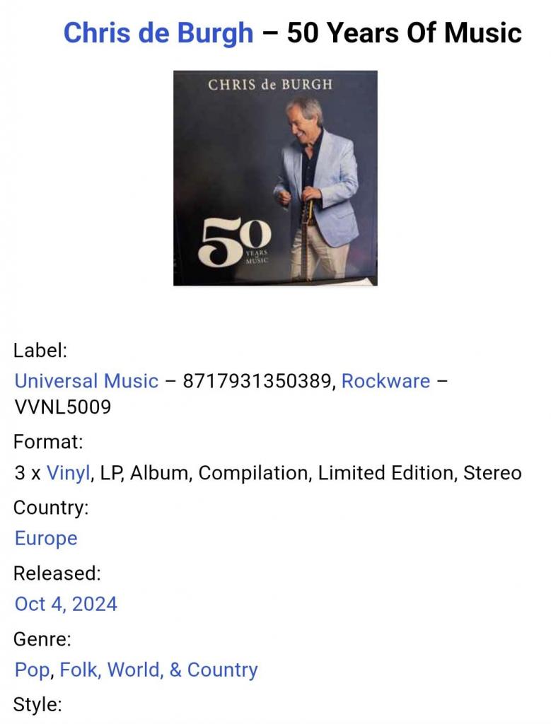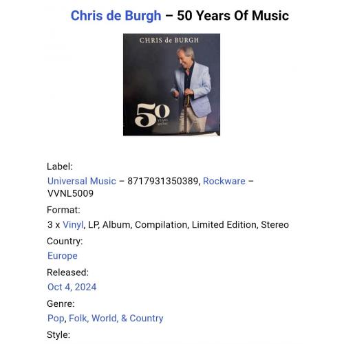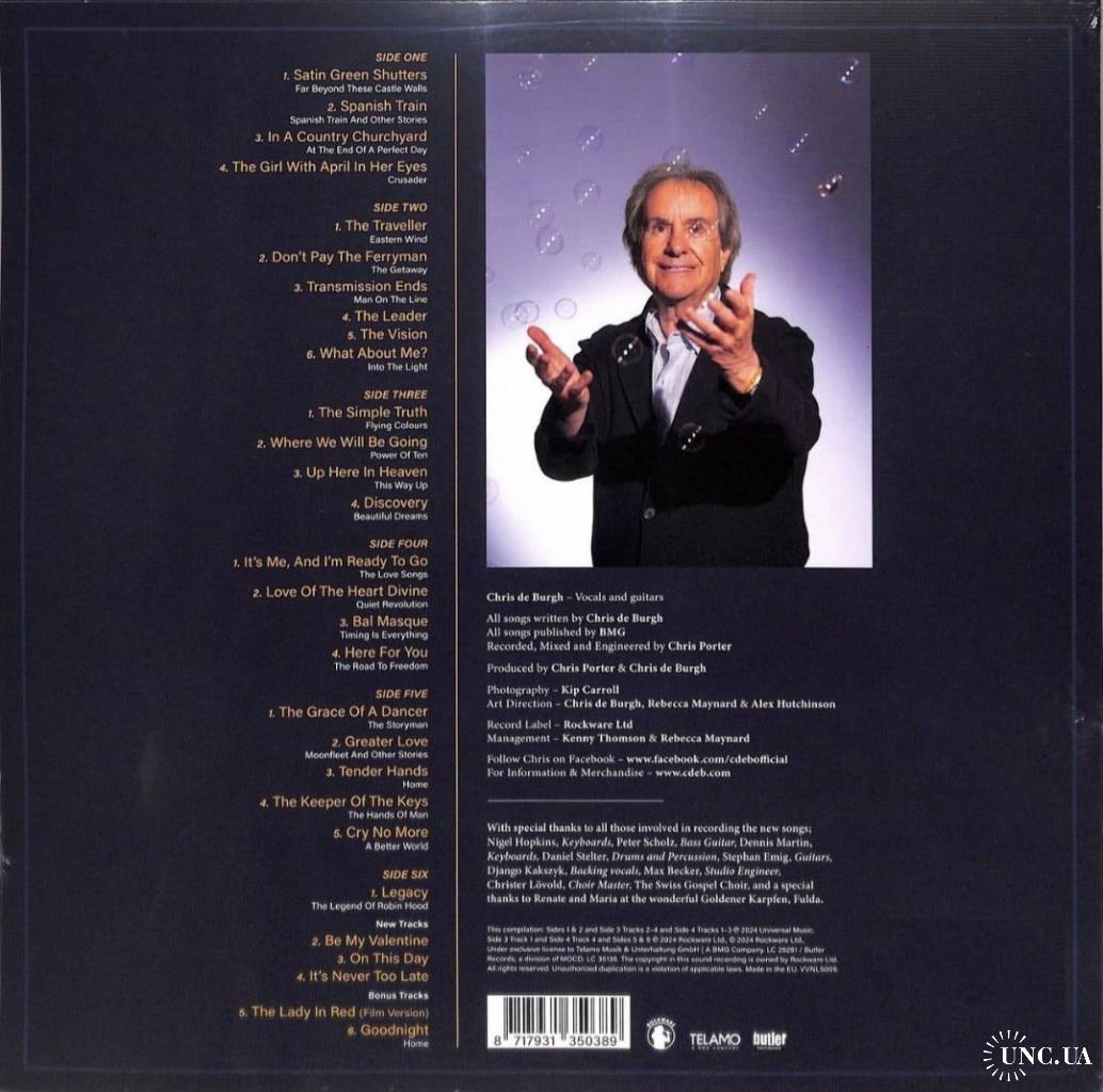 1981-2000Вінілові платівки. Офіційна збірка найкращих хітів за всю дискографію, Британсько-Ірландського поп-рок виконавця Chris De Burgh (50 Years Of Music) 1975-2010. Випуск фірми (Universal Music / Rockware) Europe, 2024-ий рік. Видання з трьох платівок (3LP). Нове, запаковане. Категорія S/S. Відправка по Україні службами доставки: Нова Пошта, Укр Пошта, Делівері. Також відправляємо посилки за кордон по цілому світу.