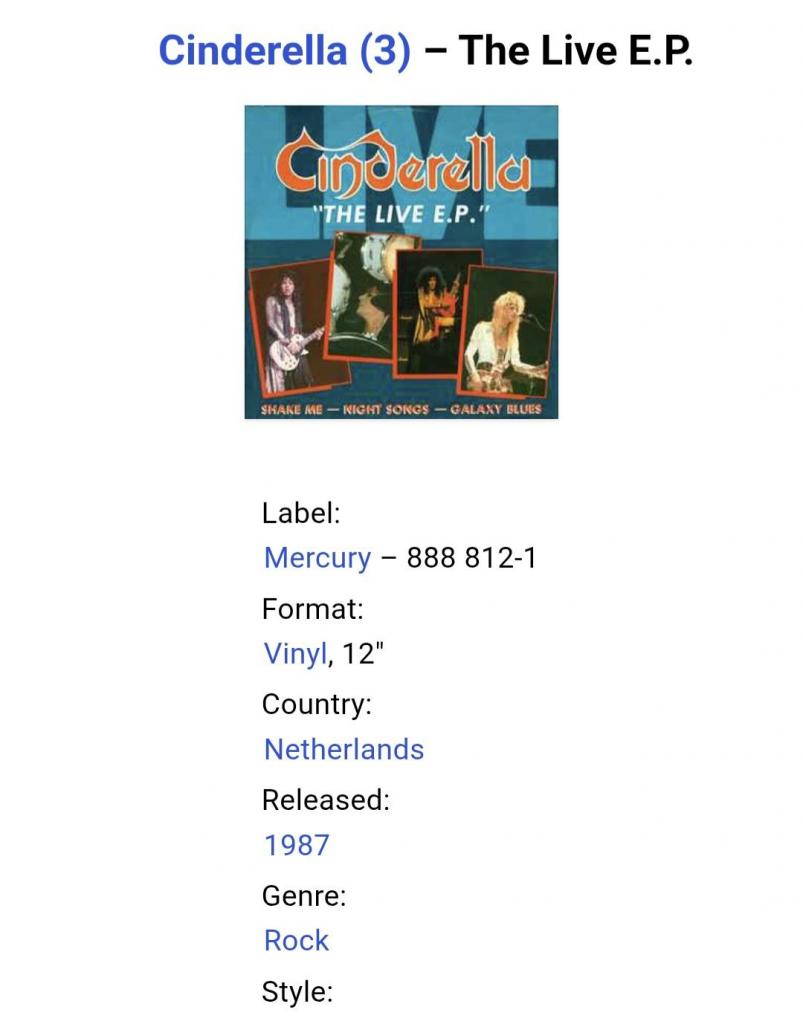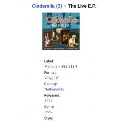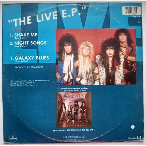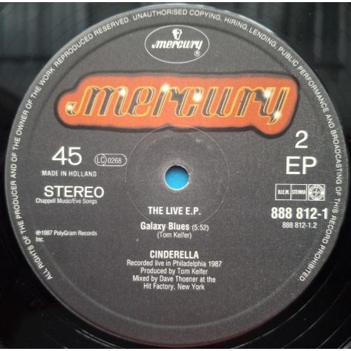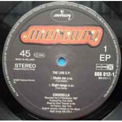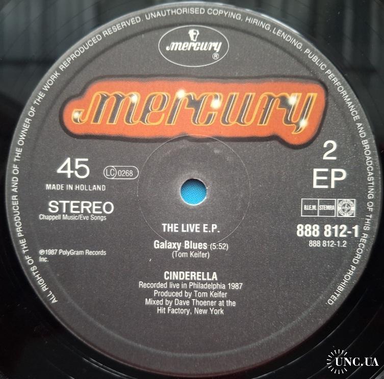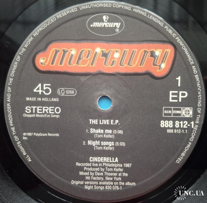 Вінілова платівка. Максі сингл (ЕР 12), з вибраних хітів живого виступу у Філадельфії, Американської глем-метал групи Cinderella, учасниками якої були Том Кіфер, Ерік Бріттінгем, покійний вже Джефф ЛаБар та Фред Коурі (The Live E.P.) 1987. Випуск фірми (Mercury) Netherlands, 1987-ий рік. Оригінальне, першопресове, Голландське видання. Стан платівки EX+. Стан конверту EX. Відправка по Україні службами доставки: Нова Пошта, Укр Пошта, Делівері. Також відправляємо посилки за кордон по цілому світу.
