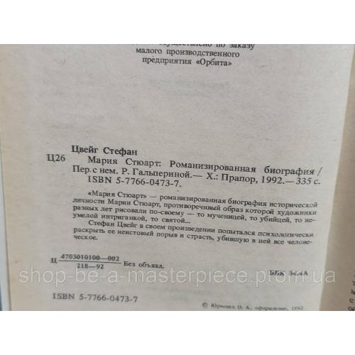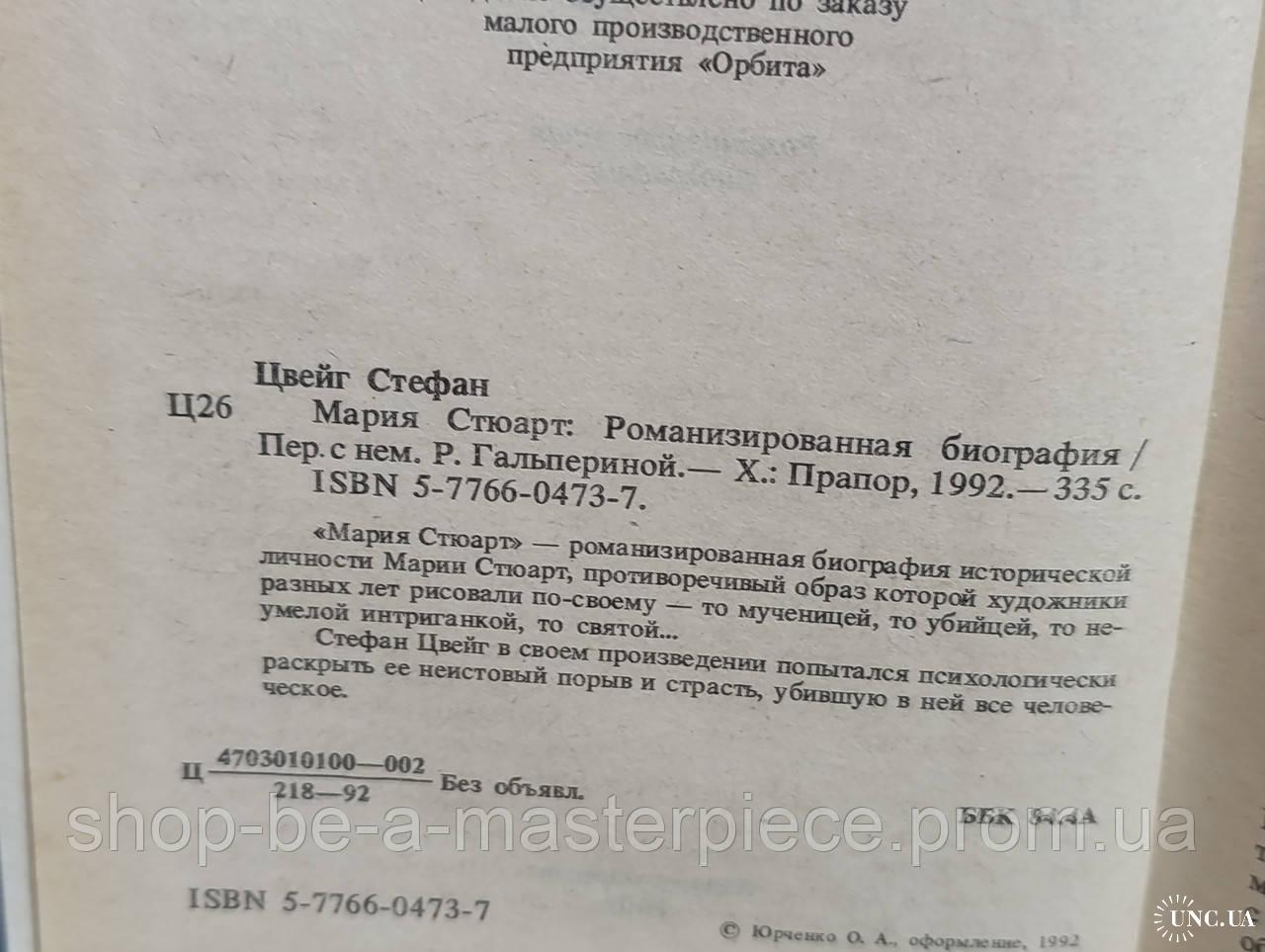 Цвейг Стефан Мария Стюарт: Романизированная биография 1992 состояние отличное есть именная подпись на обложке Пер. с нем. Р. Гальпериной. — Х.: Прапор, 1992.-335 с. «Мария Стюарт» — романизированная биография исторической личности Марии Стюарт, противоречивый образ которой художники разных лет рисовали по-своему — то мученицей, то убийцей, то не-умелой интриганкой, то святой... Стефан Цвейг в своем произведении попытался психологически раскрыть ее неистовый порыв и страсть, убившую в ней все человеческое.Відповіді продавця на ваші питання