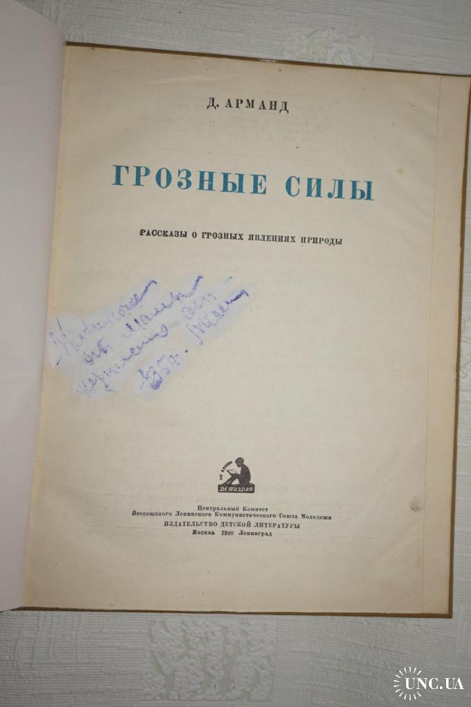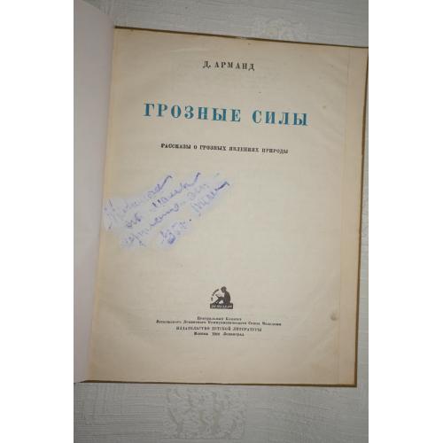 Арманд, Д.Л. Грозные силы: Рассказы о грозных явлениях природы. М.; Л.: Детиздат, 1940. - 112 с.: ил., 3 л. ил.; 22х17 см. В издательском иллюстрированном коленкоровом переплёте работы С. Мурашева.