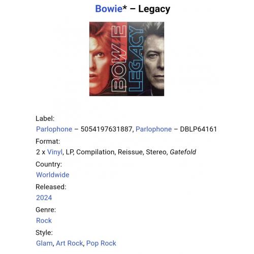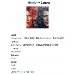 Вінілові платівки. Офіційна, посмертна, збірка найкращих хітів, яка вперше була випущена в 2016-му році, Британського глем-рок, поп-рок, арт рок, музиканта, покійного вже, Девіда Роберта Джонса, більше відомого під сценічним ім,ям Девіда Боуї (Legacy. The Very Best Of) 1969-2016. Випуск фірми (Parlophone) Worldwide, 2024-ий рік. Оригінальне, видання з двох платівок (2LP). Лімітований тираж (Limited Edition). Нове, запаковане. Категорія S/S. Відправка по Україні службами доставки: Нова Пошта, Укр Пошта, Делівері. Також відправляємо посилки за кордон по цілому світу.
