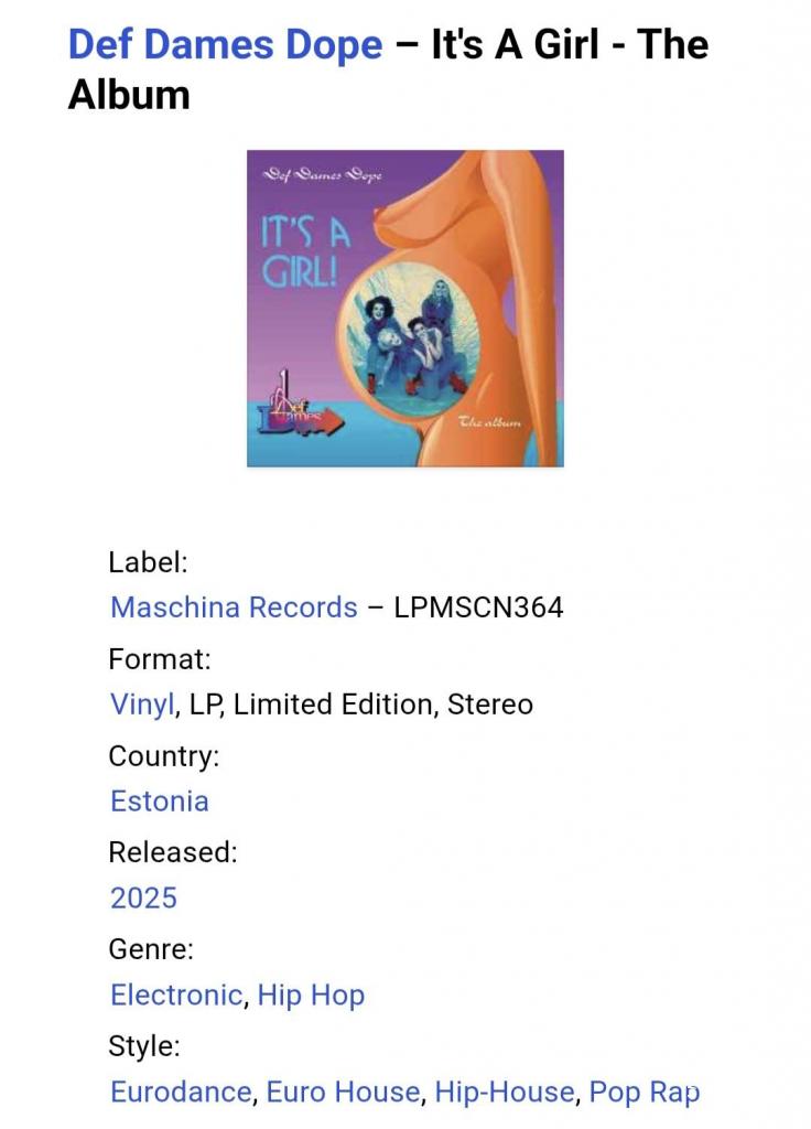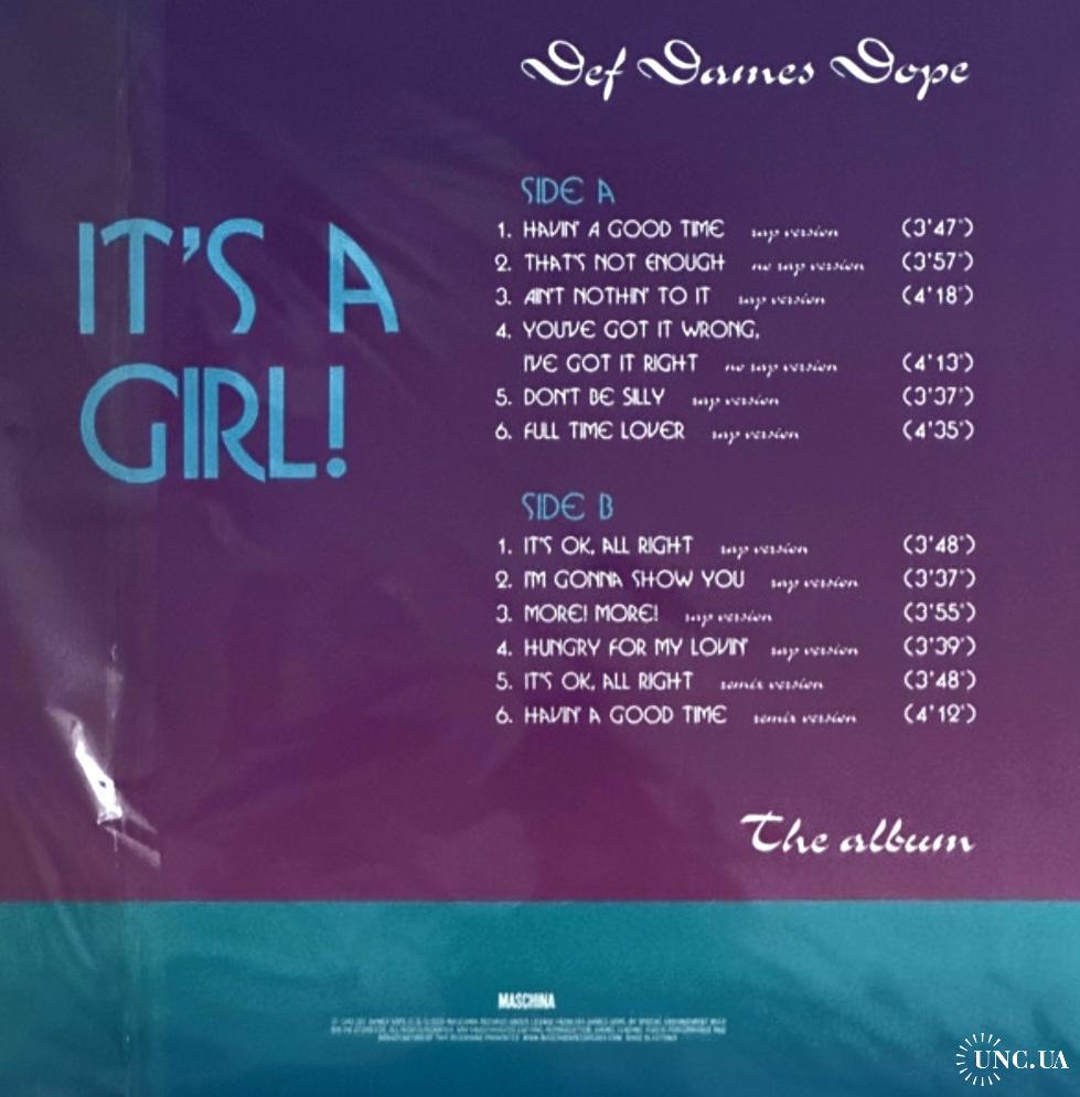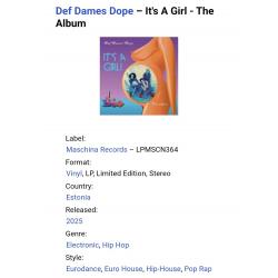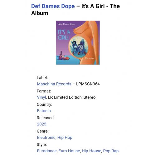 Вінілова платівка. Перший, дебютний, в дискографії, студійний альбом, Бельгійської, жіночої євро денс, хіп-хоп, поп-реп групи Def Dames Dope, до складу якої входили учасниці Лариса та Оксана Келеманс, Інгрід Герітс та Едіт Верлінден (It's A Girl. The Album) 1993. Випуск фірми (Maschina Records) Estonia, 2025-ий рік. Лімітований тираж (Limited Edition). Видання нове, запаковане. Категорія S/S. Відправка по Україні службами доставки: Нова Пошта, Укр Пошта, Делівері. Також відправляємо посилки за кордон по цілому світу.