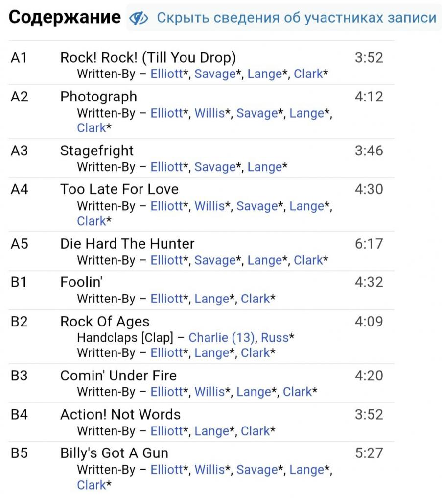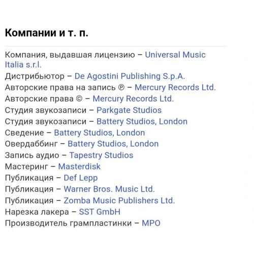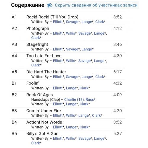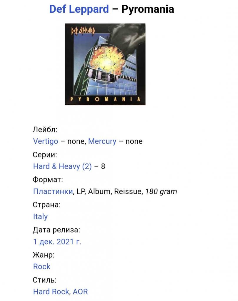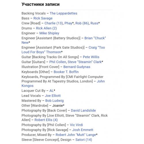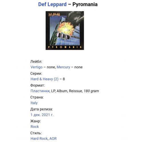 Вінілові платівки. Третій, в дискографії, студійний альбом, Британської хард-рок, глем метал групи Def Leppard, до складу якої, на той час, входили учасники Джо Елліот, Стів (Стімін) Кларк, Філ Коллен, Рік Севідж та Рік Аллен (Pyromania) 1983. Випуск фірми (Vertigo / Mercury) Italy, 2021-ий рік. Видання нове, запаковане. Категорія S/S. Відправка по Україні службами доставки: Нова Пошта, Укр Пошта, Делівері. Також відправляємо посилки за кордон по цілому світу.