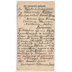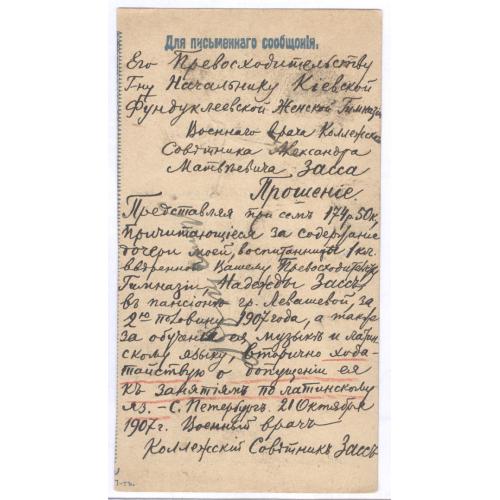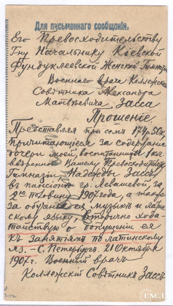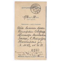 Отрезной купон денежного перевода 174 рубля 50 копеек, отправленного Военным врачом Коллежским Советником Александром Матвеевичом Зассом из С. Петербурга 23 октября 1907 года в Киевскую Фундуклеевскую Женскую Гимназию и в Пансион графини Левашовой за содержание и обучение его дочери Надежды Засс.