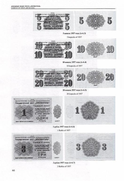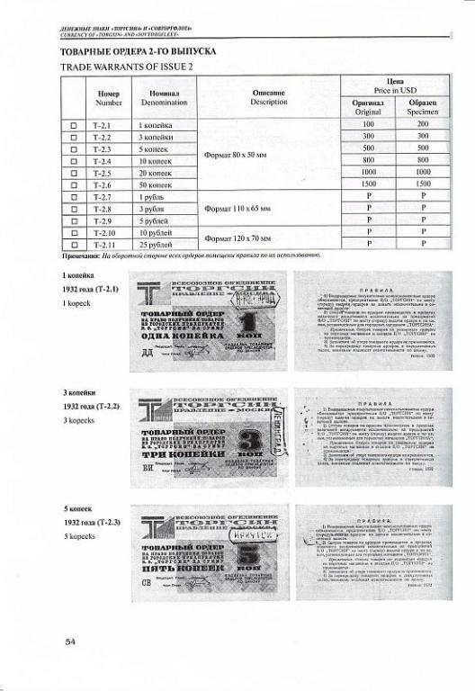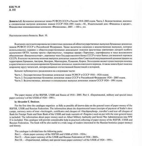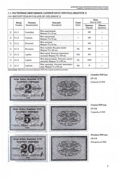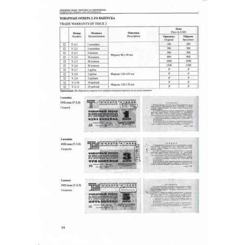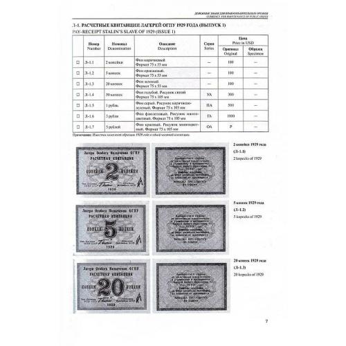 Также включены сведения о ведомственных выпусках, которые использовались наравне с общегосударственными денежными знаками (расчетные квитанции лагерей особого назначения ОГПУ, талоны треста «Арктикуголь», товарные ордера «Торгсина», сертификаты и чеки всесоюзного объединения «Внешпосылторг», дорожные чеки Государственного Банка СССР и чеки Банка для внешней торговли СССР).