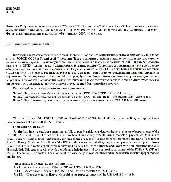 В каталоге систематизированы все известные сведения об общегосударственных выпусках бумажных денежных знаков РСФСР, СССР и Российской Федерации.