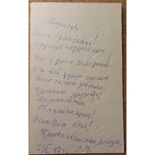1981-2000Безымянная цветная открытка. Одинарная. Признаков отрыва возможного разворота нет. Отсутствуют сведения о художнике, издании, стране происхождения и годе выпуска. Только год в рукописном тексте 1997.