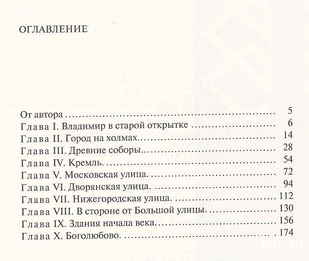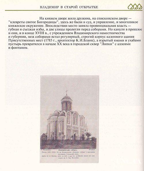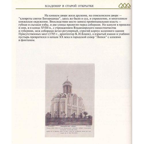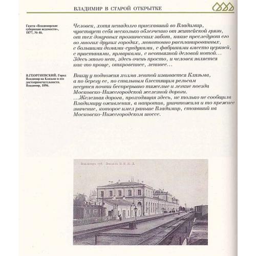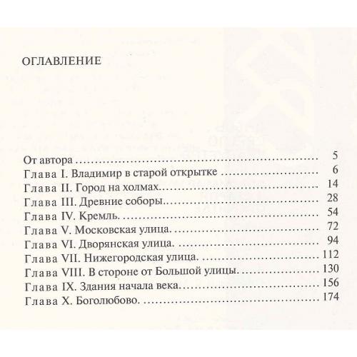 Книга рассказывает об истории древнего русского города Владимира на Клязьме, основанного князем Владимиром Святославичем в 990 (возможно,992) году. Авторы используют иллюстративный материал, историко-статистические сведения, рукописи, летописные источники. Старые открытки позволяют увидеть Владимирский Кремль, соборы, церкви, монастыри, улицы города в первозданном виде.