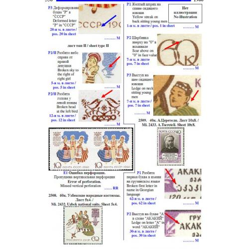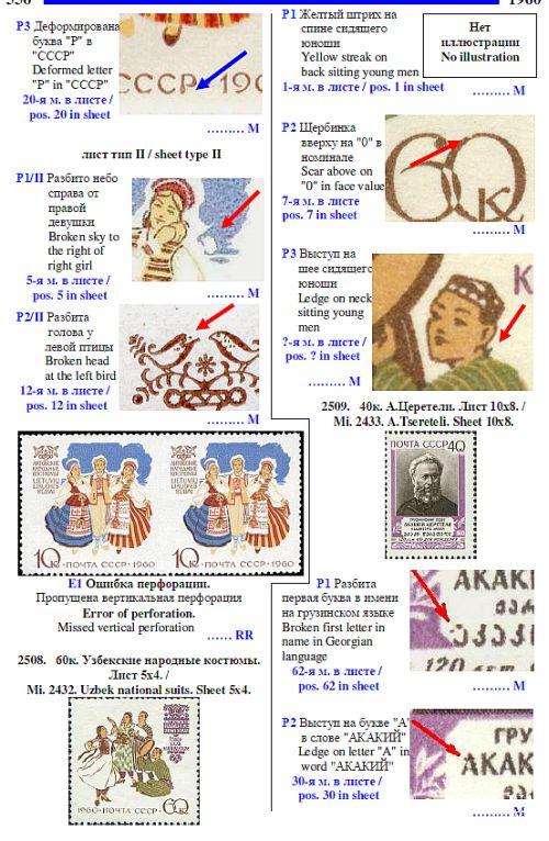 Каталог - справочник разновидностей почтовых марок СССР включает в себя наиболее известные разновидности марок периода 1940-1960 г.г. Основное содержание каталога - это разновидности почтовых марок, получившиеся из-за различных дефектов клише печатной платы. К дефектам клише относятся различные поломки деталей рисунка клише, в ряде случаев износ клише, а так же прилипание сгустков типографской краски. Все это приводит к некоторым изменениям рисунка марки, появлению дополнительных пятен, различных колечек.