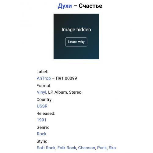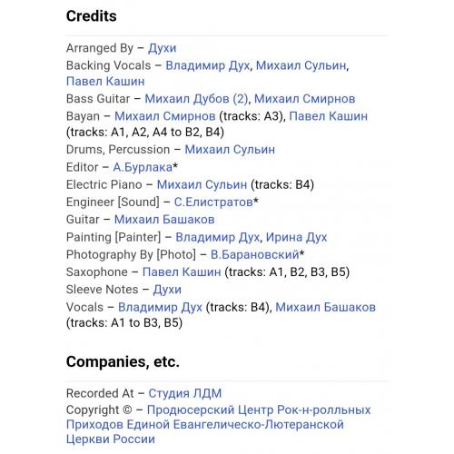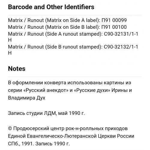 Вінілова платівка. Другий, в дискографії, студійний альбом, російської (радянської) фолк-панк, фолк-рок групи Духи, до складу якої, на той час, входили Михайло Башаков, Володимир Духарін (Дух), Михайло Дубов, Павло Кашин, Михайло Сульїн та Михайло Смірнов (Счастье) 1990. Випуск фірми (Антроп / Antrop) Russia, 1991-ий рік. Оригінальне першопресове видання (1st Press). Лімітований тираж (Limited Edition). Рідкісне (Rare). Стан платівки VG/VG+. Стан конверту ЕХ+. Відправка по Україні службами доставки: Нова Пошта, Укр Пошта, Делівері. Також відправляємо посилки за кордон по цілому світу.