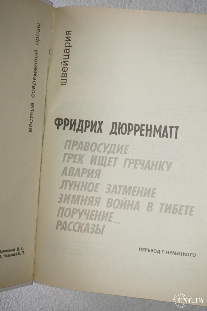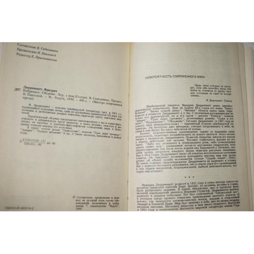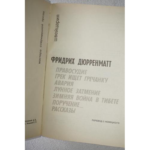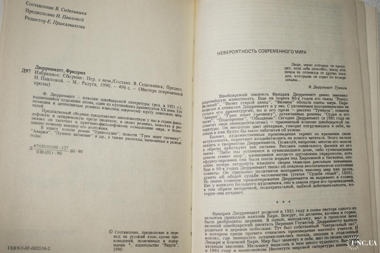 Серия «Мастера современной прозы. Швейцария». Сост. В.Седельника. Перевод с немецкого. Предисл. Н.Павловой. М. Радуга, 1990г. 496 с., ил. Палiтурка / переплет: твердый, слегка увеличенный формат.
