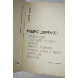 Фридрих Дюрренматт - классик швейцарской литературы (род. В 1921 г.), замечательный художник слова, один из величайших писателей XX века. Его комедии и детективные романы знакомы широкому кругу советских читателей. Предлагаемый сборник представляет малоизвестную у нас в стране философскую и сатирическую прозу литератора, в своих романах, повестях и рассказах он тяготеет к притчево-философскому пониманию мира, к беспощадно точному исследованию его состояния. В книгу вошли роман `Правосудие`, повести `Грек ищет гречанку`, `Авария`, `Лунное затмение` и др. , а также рассказы, созданные в различные годы. «Содержание» - смотри фото. Вес книги 570 гр.