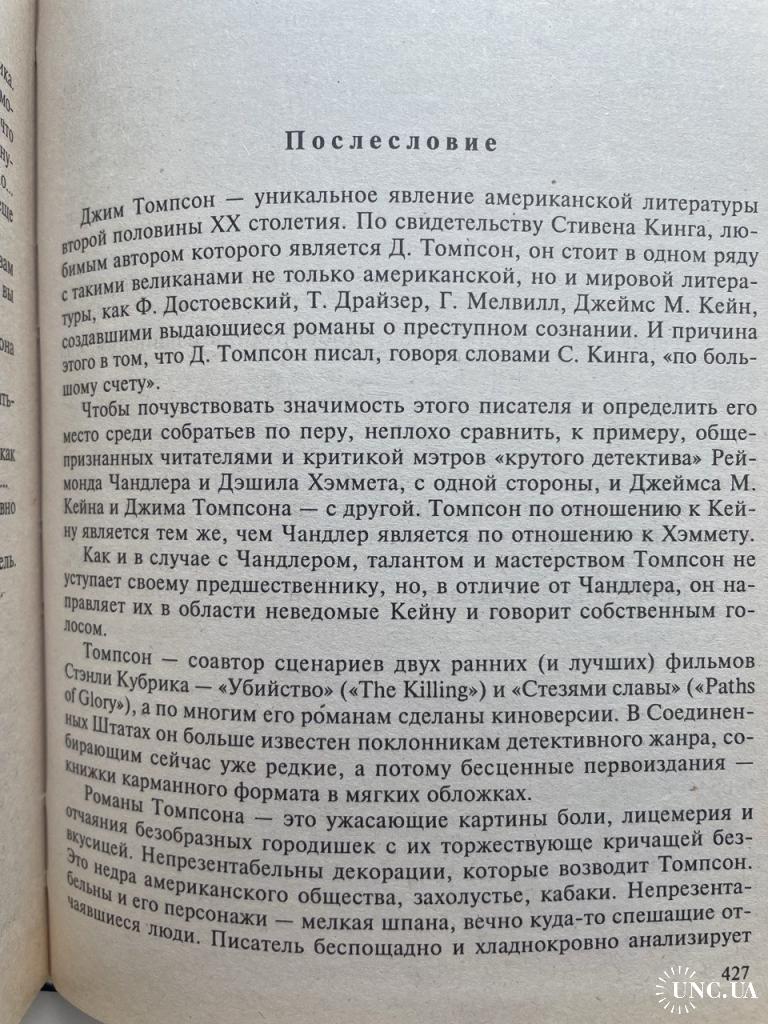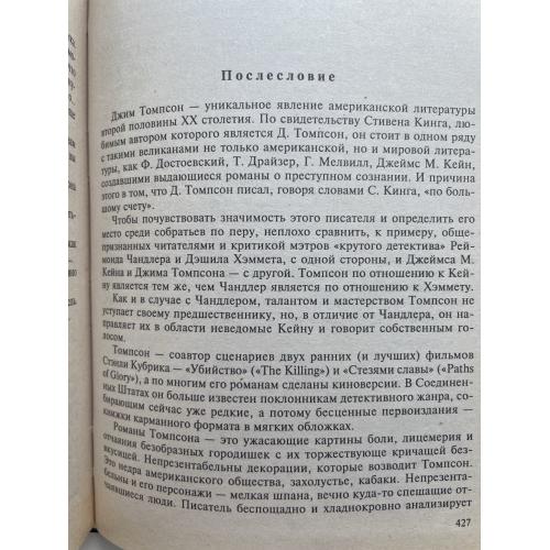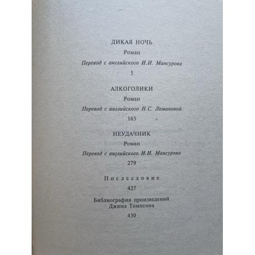 Романы Джима Томпсона - одного из патриархов крутого детектива и нуара - экранизировал Стэнли Кубрик, Сэм Пекинпа, Майкл Винрботтом, Стивен Фрирз и др. Наемный убийца по кличке Малыш получает приказ уничтожить преступника ("Дикая ночь"). Бескорыстный врач захудалой клиники для алкоголиков после перенесенных мучений совершенно неожиданно поймал птицу счастья за огненный хвост ("Алкоголики"). До последней минуты надеется старик, отец, что сын - писатель-неудачник - сможет забрать его домой из лечебницы ("Неудачник"). Разноплановых героев Джима Томпсона, любимого писателя Стивена Кинга, объединяет то, что, они вынуждены действовать в обстоятельствах, где спираль сюжета закручена между их жизнью и смертью.