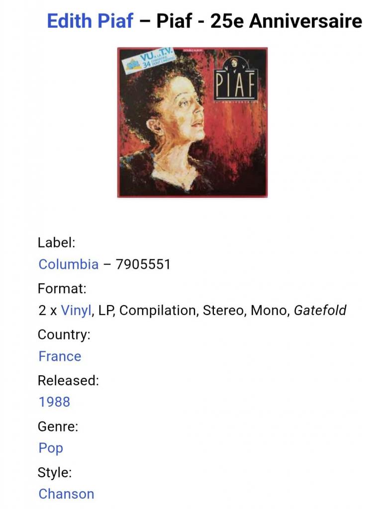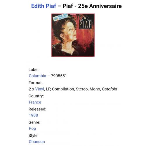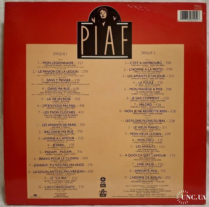Вінілові платівки. Офіційна збірка найкращих хітів легендарної кіноактриси і музичної виконавиці стилю шансон, володарки посмертних титулів зали слави премії Греммі, Срібного Диску, Золотого Диску, Платинового Диску, покійної вже Едіт-Джованни Гасьйон, більше відомої під сценічним ім'ям Едіт Піаф (Piaf 25e Anniversarie) 1973-85. Випуск фірми (Columbia) France, 1988-ий рік. Оригінальне, рідне, першопресове, Французьке видання з двох платівок (2LP). Стан платівок ЕХ+. Конверт глянцевий, розворотний (Gatefold). Стан конверту EX+. Оригінальні внутрішні конверти з написами Piaf. Відправка по Україні службами доставки: Нова Пошта, Укр Пошта, Делівері. Також відправляємо посилки за кордон по цілому світу.