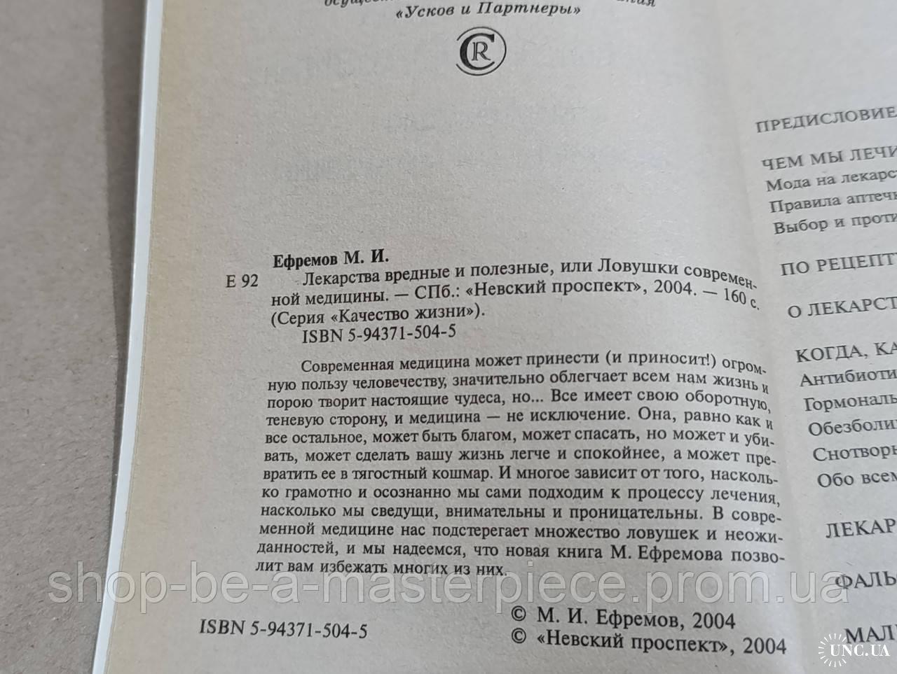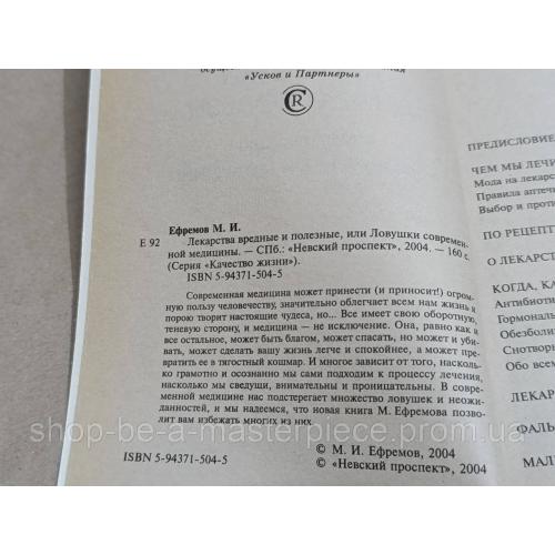 Ефремов М. И. Лекарства вредные и полезные, или Ловушки современной медицины. 2004 - 160 с. (Серия «Качество жизни»). мягкая глянцевая обложка. состояние идеал Современная медицина может принести (и приносит!) огромную пользу человечеству, значительно облегчает всем нам жизнь и порою творит настоящие чудеса, но... Все имеет свою оборотную, теневую сторону, и медицина — не исключение. Она, равно как и все остальное, может быть благом, может спасать, но может и убивать, может сделать вашу жизнь легче и спокойнее, а может превратить ее в тягостный кошмар. И многое зависит от того, насколько грамотно и осознанно мы сами подходим к процессу лечения, насколько мы сведущи, внимательны и проницательны. В современной медицине нас подстерегает множество ловушек и неожиданностей, и мы надеемся, что новая книга М. Ефремова позволит вам избежать многих из них.Відповіді продавця на ваші питання