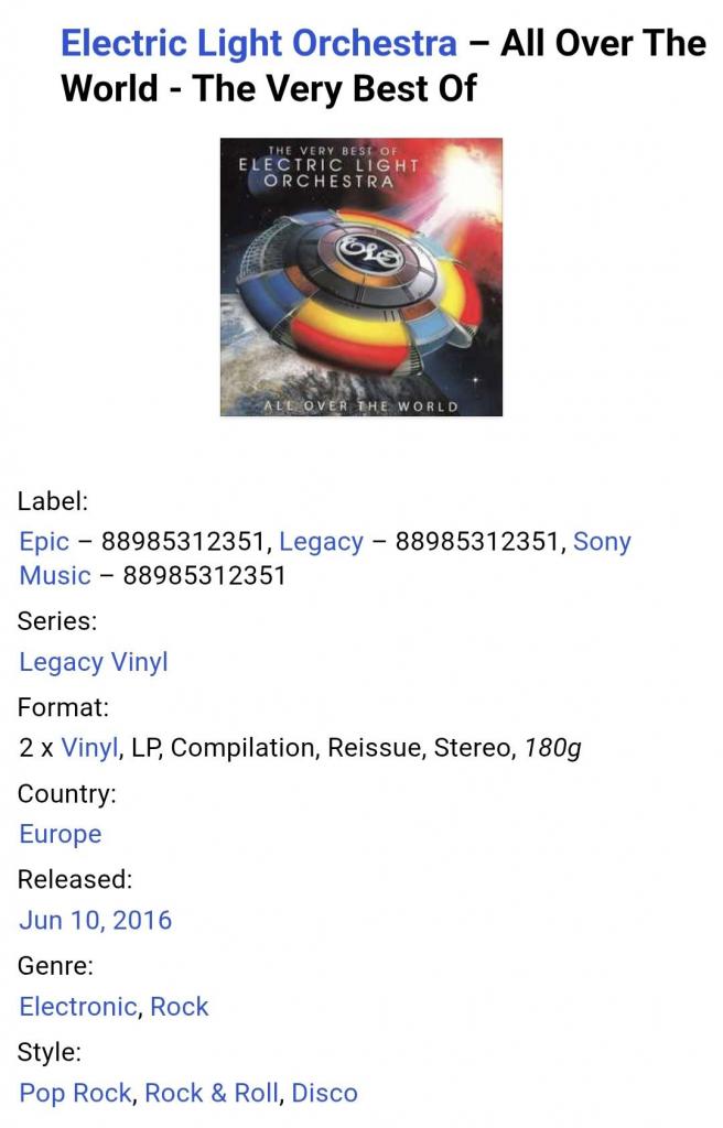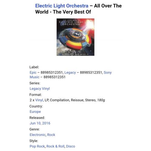 Вінілові платівки. Офіційна збірка найкращих хітів за всю дискографію, яка вперше була випущена в 2005-му році, Британської прог-рок, поп-рок групи Electric Light Orchestra, яка складалась з учасників Джеффа Лінна, Річарда Тенді, Роя Вуда та Біва Бівена (All Over The World. The Very Best Of) 1971-2001. Випуск фірми (Epic / Legacy / Sony Music) Europe, 2016-ий рік. Видання з двох платівок (2LP). Нове, запаковане. Категорія S/S. Відправка по Україні службами доставки: Нова Пошта, Укр Пошта, Делівері. Також відправляємо посилки за кордон по цілому світу.