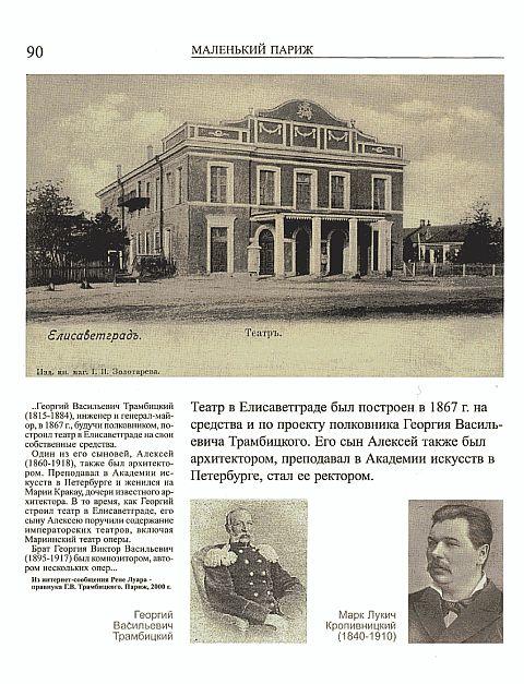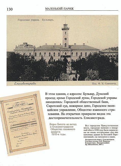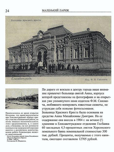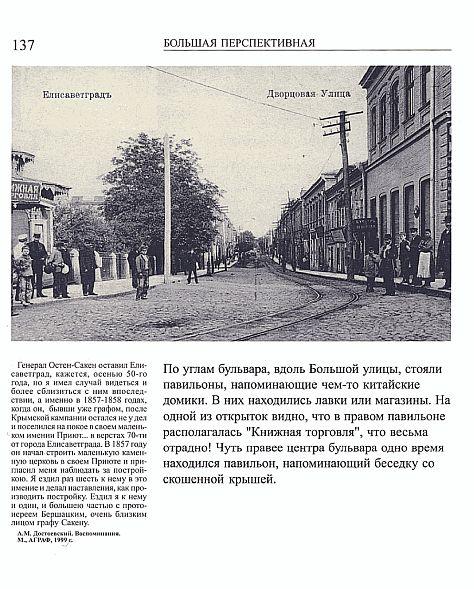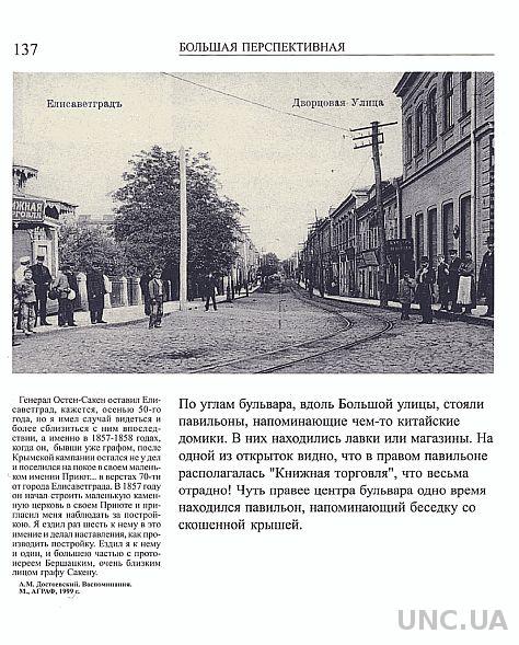Книга имеет подзаголовок «Елисаветград в старой открытке», и действительно, каждое описание, каждый исторический экскурс сопровождается открытками начала века из личной коллекции автора - видами Дворцовой, Большой Перспективной, женской гимназии, кавалерийского училища, трамвайного депо.
