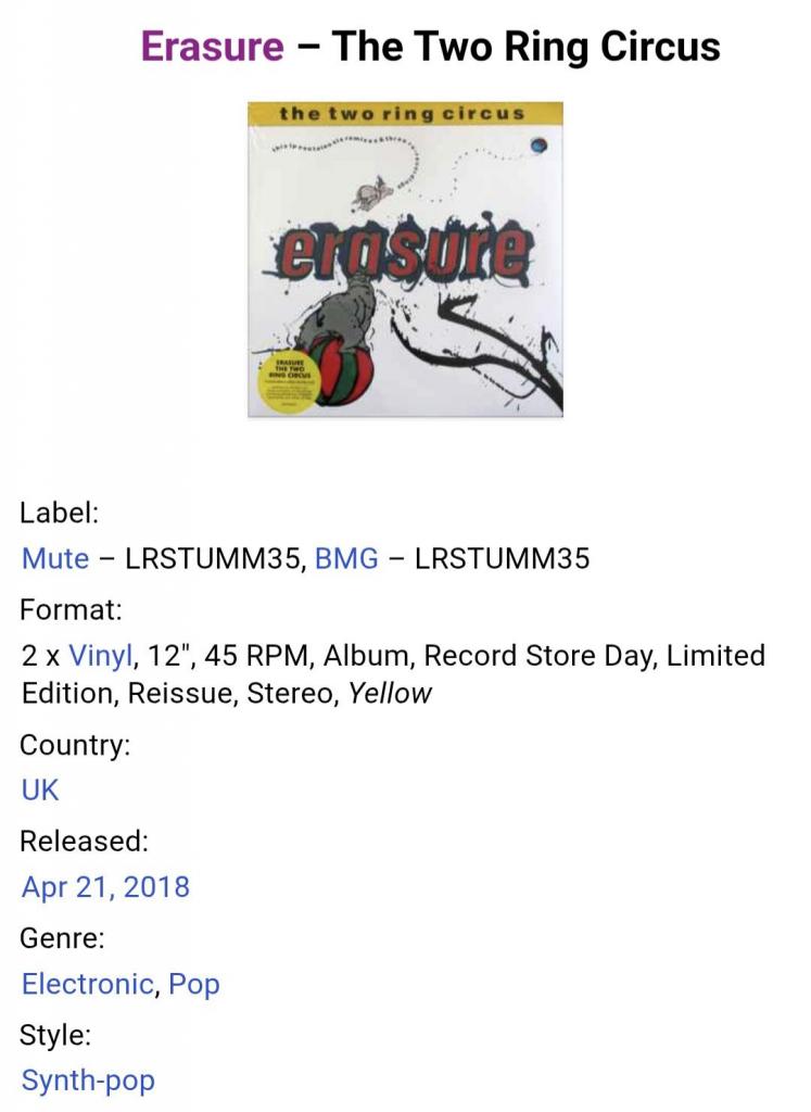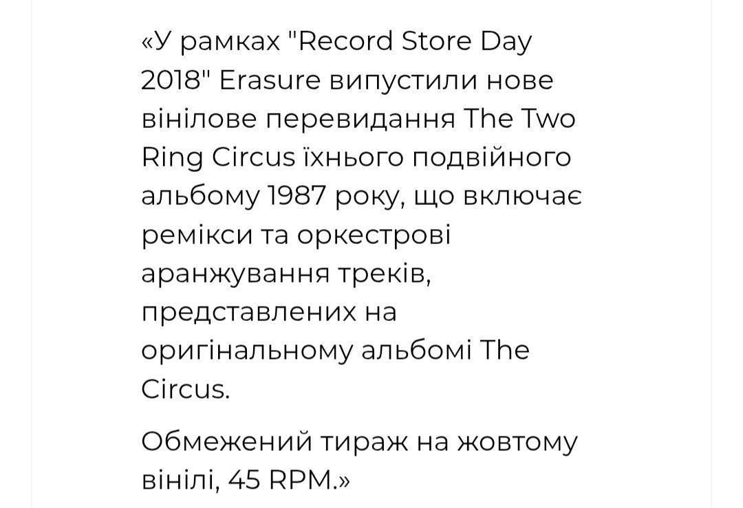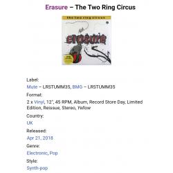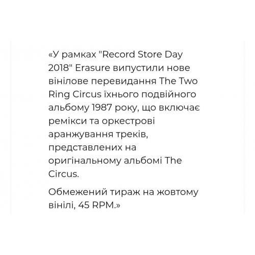 Вінілові платівки. Перша, в дискографії, офіційна збірка реміксів на композиції другого студійного альбому, яка вперше була випущена в 1987-му році, Британського електронного сінті поп дуету Erasure, який складається з виконавців Вінса Кларка та Енді Бела (The Two Ring Circus) 1987. Випуск фірми (Mute / BMG) England, 2018-ий рік. Видання з двох платівок (2LP). Кольорові вініли (Coloured Vinyl). Лімітований тираж (Limited Edition). Нове, запаковане. Категорія S/S. Відправка по Україні службами доставки: Нова Пошта, Укр Пошта, Делівері. Також відправляємо посилки за кордон по цілому світу.