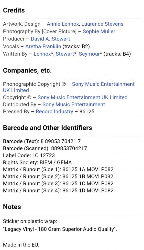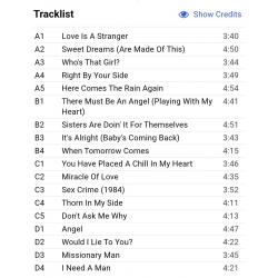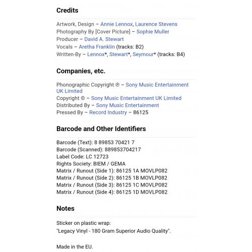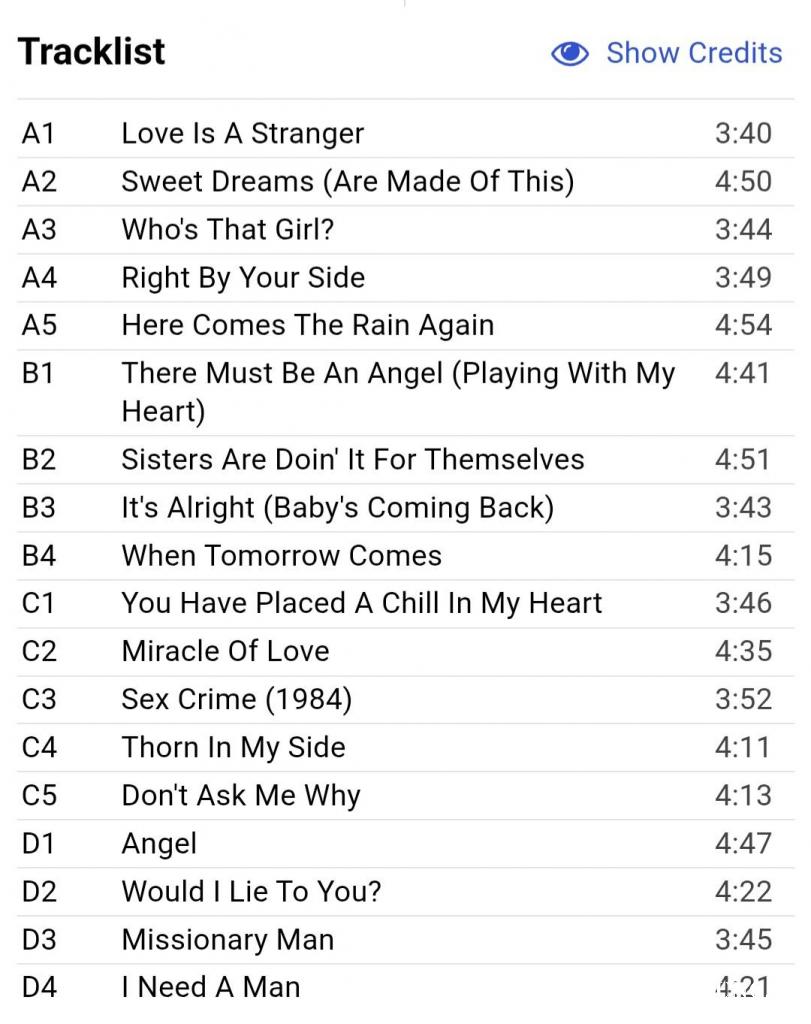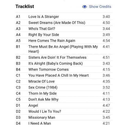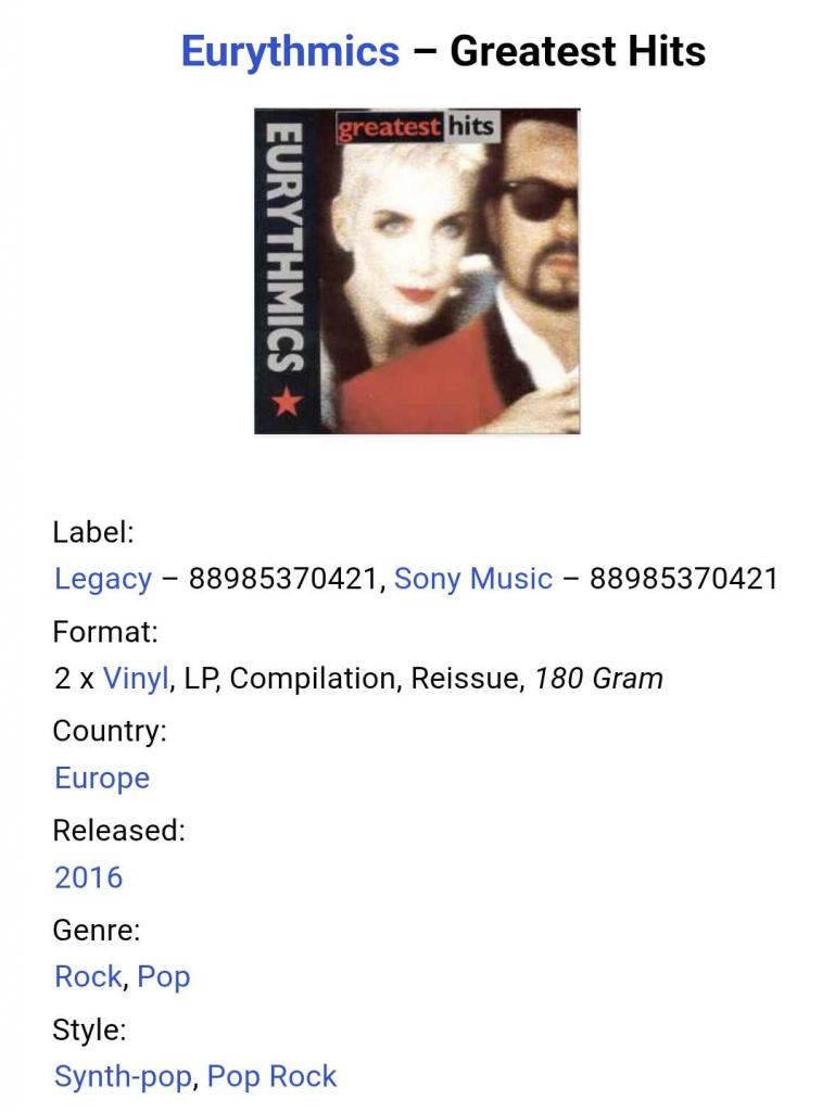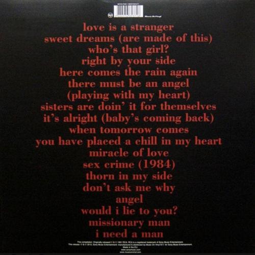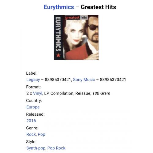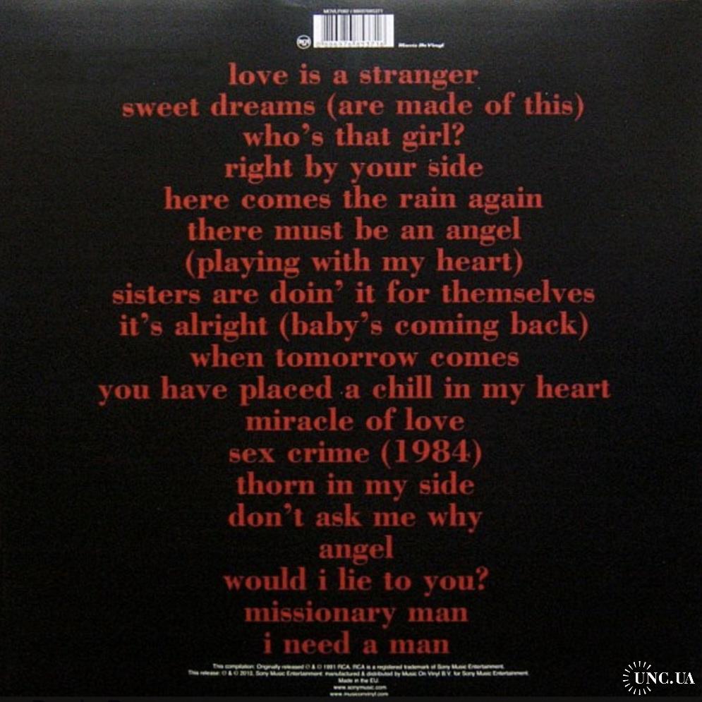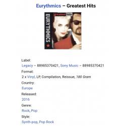 Вінілові платівки. Офіційна збірка найкращих хітів, яка вперше була випущена в 1991-му році, Британського поп-рок дуету Eurythmics, учасниками якого були Енні Леннокс та Девід Стюарт (Greatest Hits) 1981-89. Випуск фірми (Legacy / Sony Music) Europe, 2016-ий рік. Видання з двох платівок (2LP). Видання нове, запаковане. Категорія S/S. Відправка по Україні службами доставки: Нова Пошта, Укр Пошта, Делівері. Також відправляємо посилки за кордон по цілому світу.