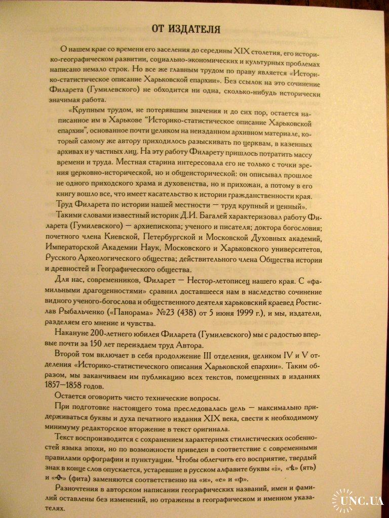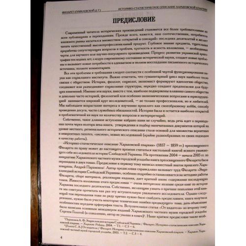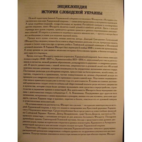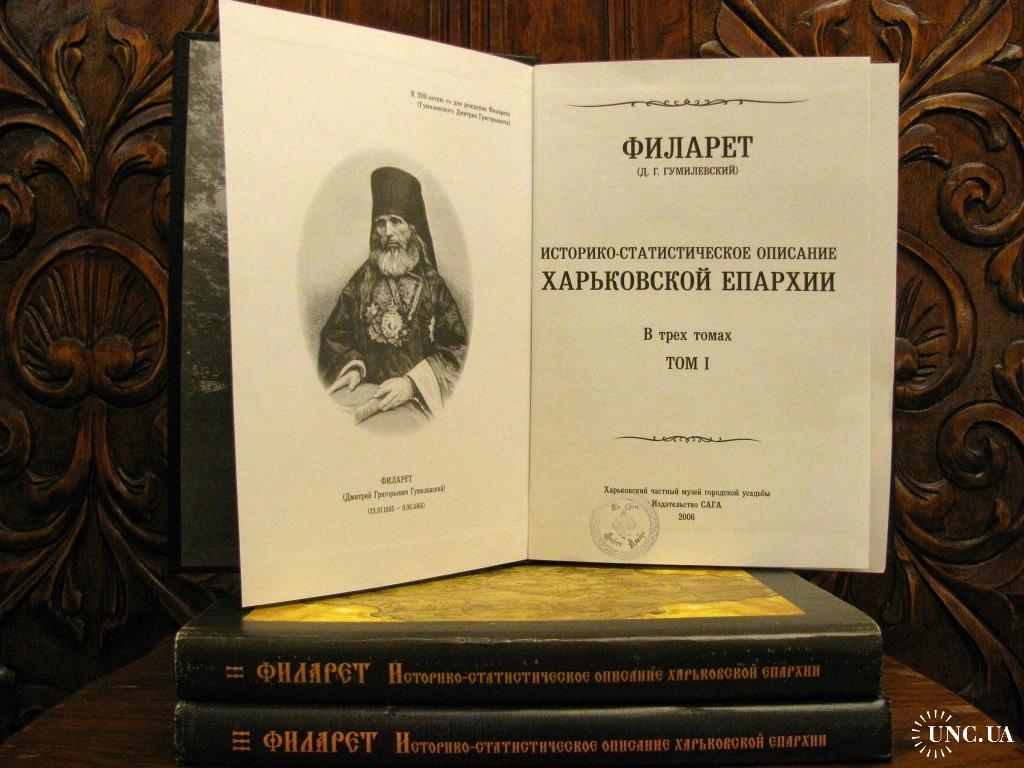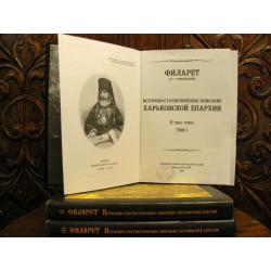 К большому сожалению, первое издание этого фундаментального труда Филарета эпохи Царской России 1852 -1858 годов уже давно стало библиографической редкостью, поэтому представленное Вам сегодня его переиздание 2005-2006 годов – большой подарок всем ценителям и любителям украинской старины.Ведь этот роскошный трехтомник -не просто современное переиздание важного фундаментального труда по истории Харьковского края и окраин, а дополненное научное издание, содержащее ценные материалы, которые были собраны современными исследователями. Любознательный читатель в третьем, дополнительном томе найдет ценнейшие сведения, комментарии, обширный справочный и дополнительный материал.