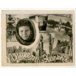 фото-кич Привет из Харькова - портрет женщины в платке , виды города - вокзал Госпром 1956 9х12 см