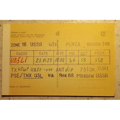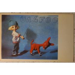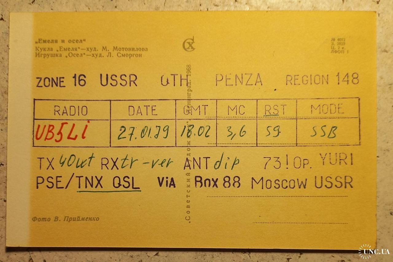 1961-1980Кукла «Емеля» -худ. М. Мотовилова. Игрушка «Осел» -худ. Л. Сморгон. Изд-во «Советский художник»,Ленинград. Открытка заполнена, как QSL-карточка. На лицевой стороне стоит штамп позывного - сигнала радиолюбителя из Пензы. На обратной стороне – данные радиообмена в эфире. Карточка без дефектов. Состояние отличное.