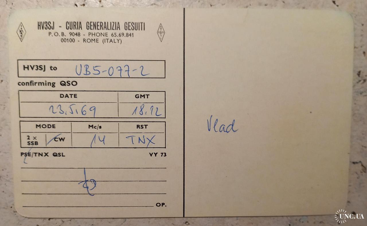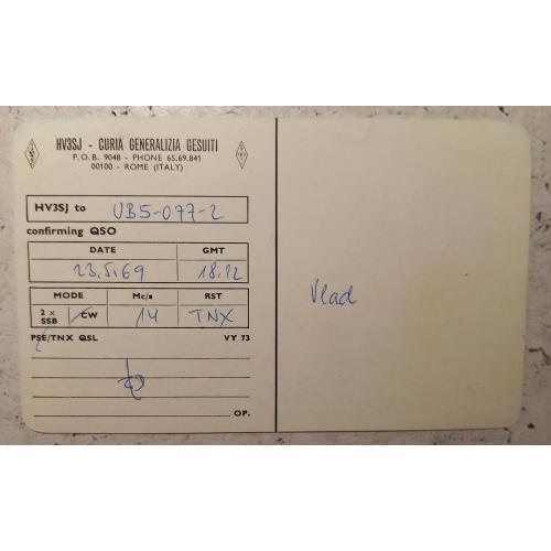 1961-1980На лицевой стороне на фоне фрагмента Ватикан Сити акцентировано внимание на мачту с вращающейся антенной типа «двойной квадрат» и позывной-сигнал любительской радиостанции, популяризируя тем самым радиолюбительское движение . На обратной стороне вверху имеется текст: «HV3SJ - Генеральная курия иезуитов». Ниже приведены данные радиообмена в эфире. Карточка без дефектов. Состояние идеальное.